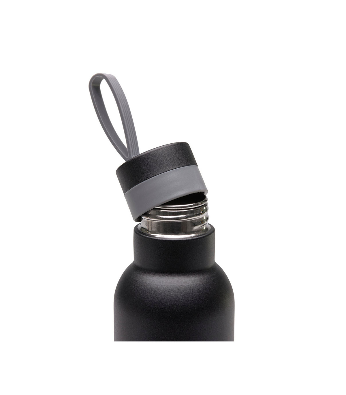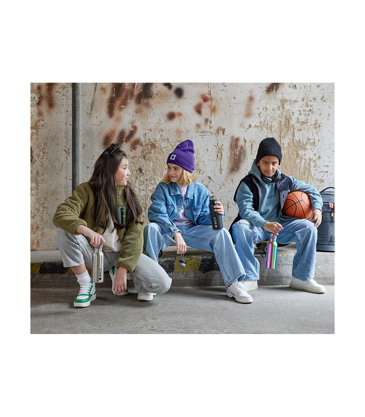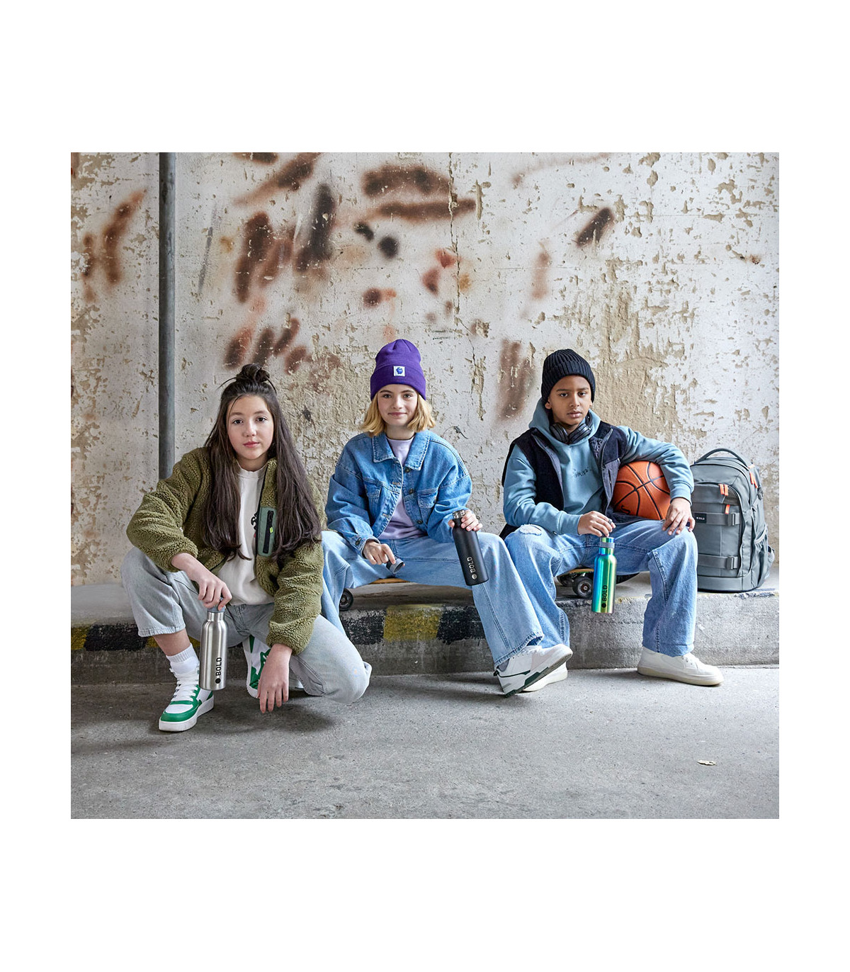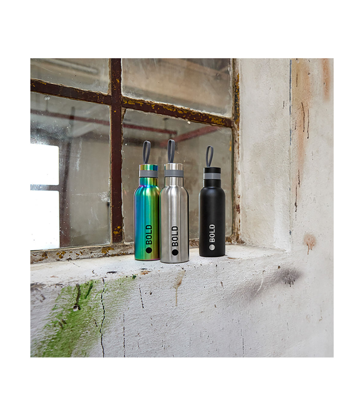The BOLD stainless steel bottle is perfect for staying hydrated throughout the school day. With its 750ml capacity, it's handy when you're thirsty. In addition, it is resistant, leak-proof and BPA-free, so you can use it for any non-carbonated, cold or warm drink. The silicone loop on the screw cap makes it easy to transport.