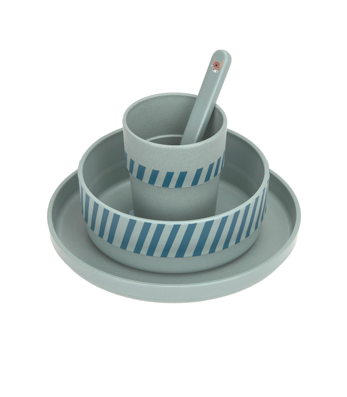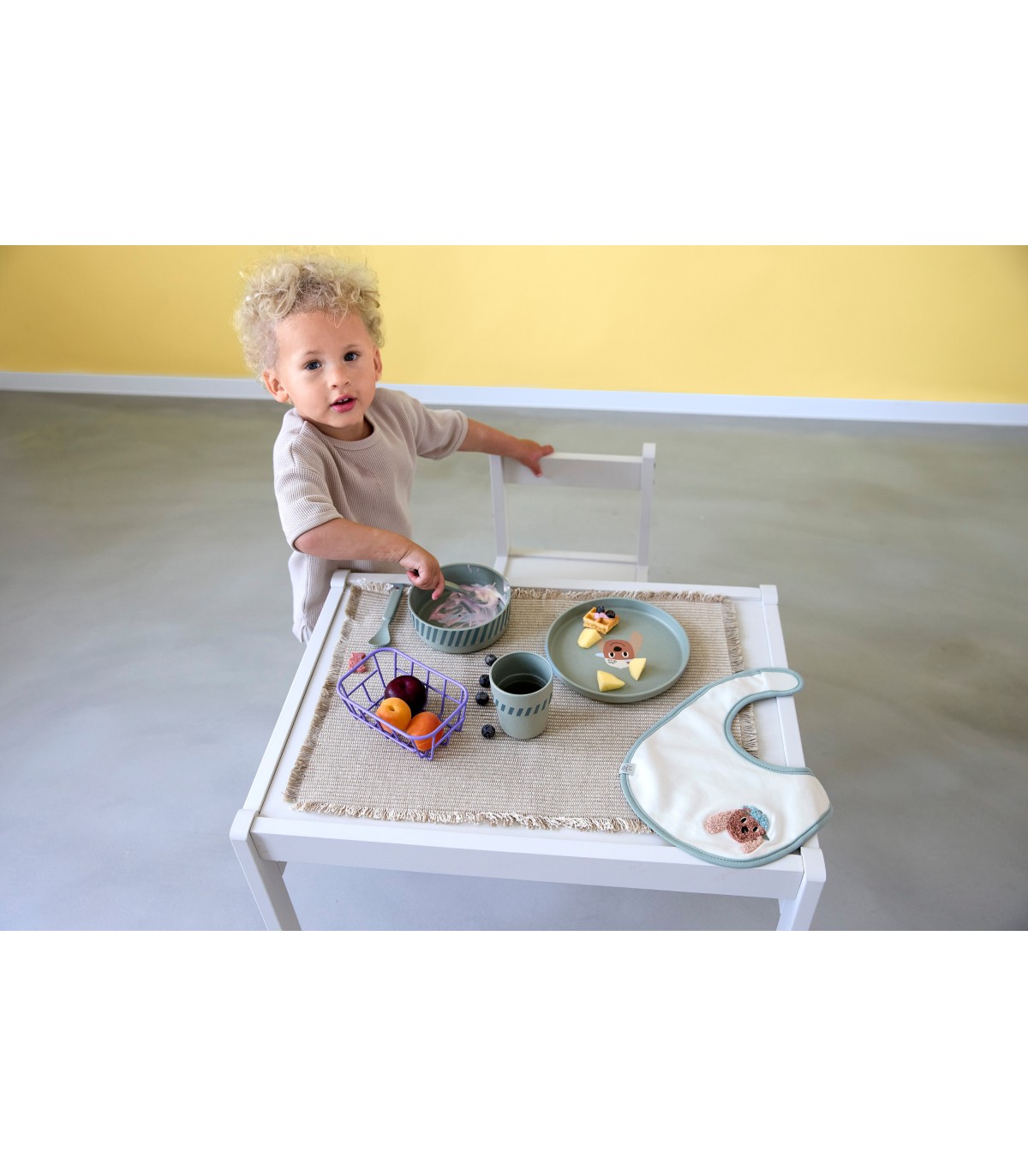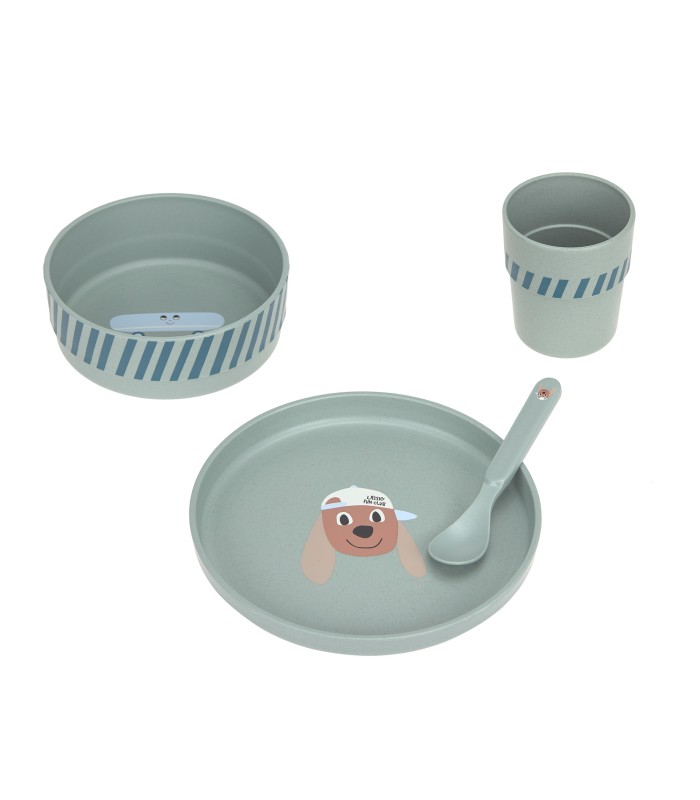 Children's tableware set consisting of 4 pieces: plate, bowl, glass and spoon, made of cellulose, a sustainable, safe and BPA-free material. Its shape and high edges allow the little ones to learn to eat independently.