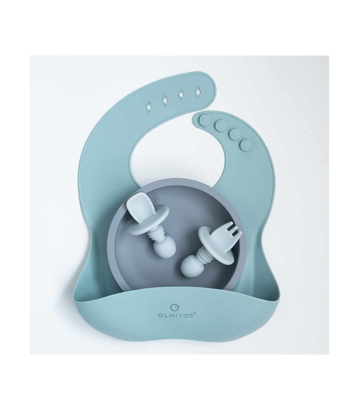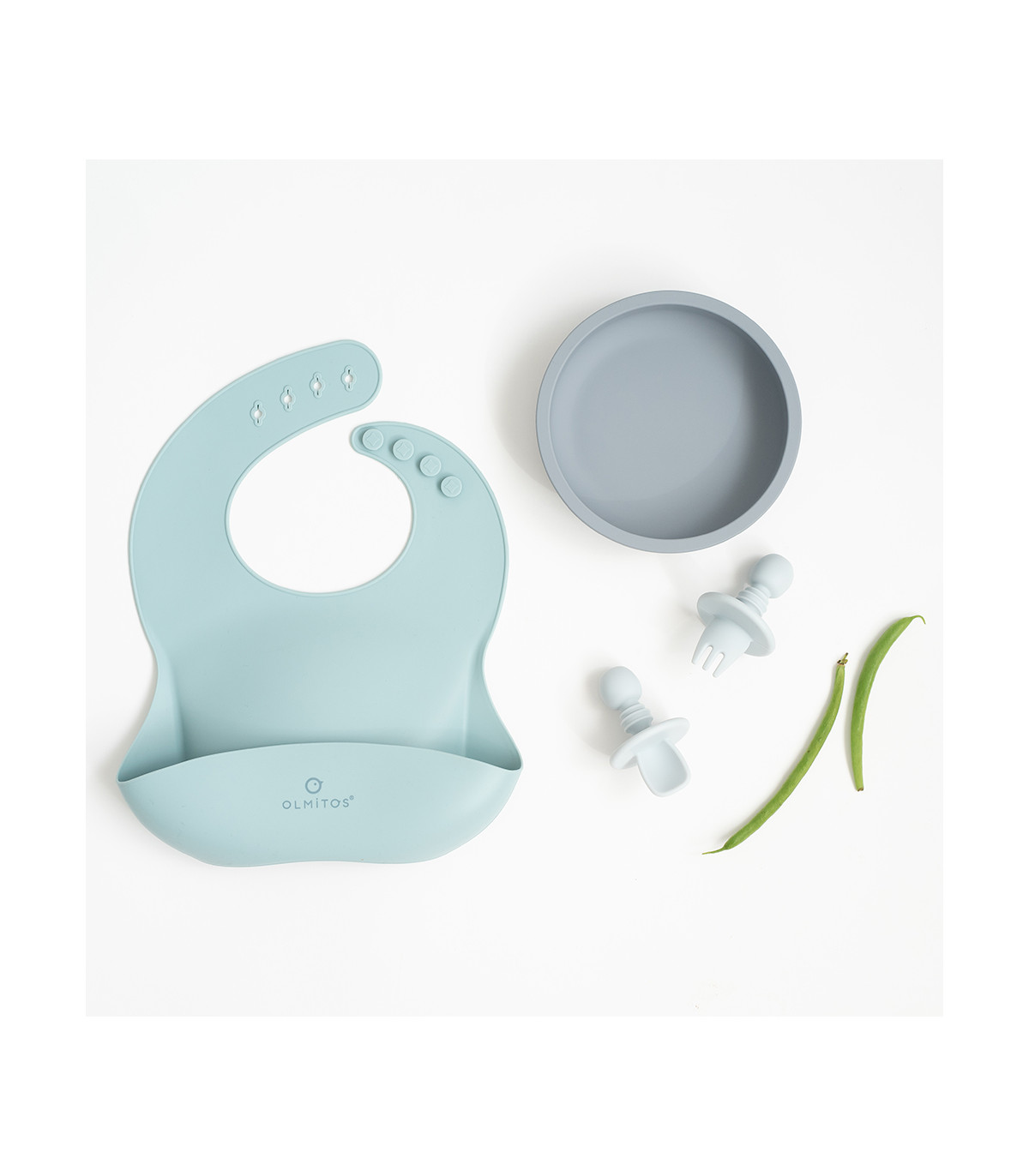 Baby crockery made of food grade silicone ideal for the beginning of complementary feeding. Composed of a bib, plate and small cutlery with an anatomical shape so that the baby learns to use them.