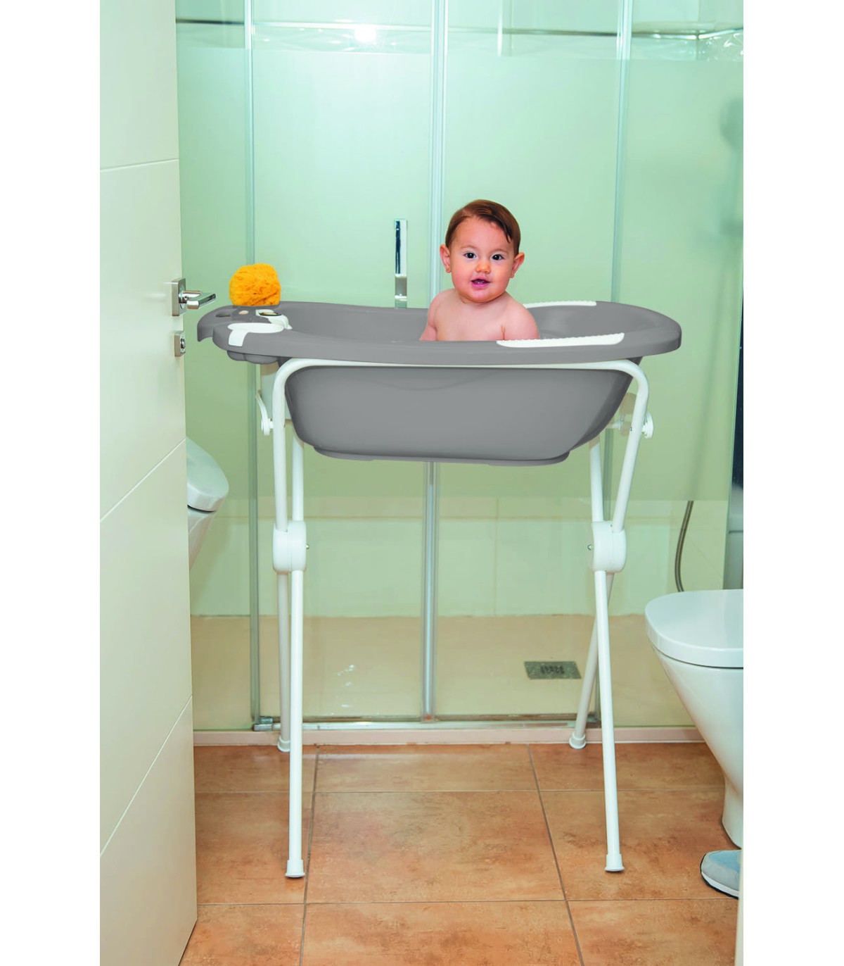 Practical bathtub tray with anti-slip inserts on the sides and removable hammock. It has a very functional design thanks to the bucket to clean the baby's head, the department for products and the temperature measuring thermometer. It also has a valve to drain the water easily.