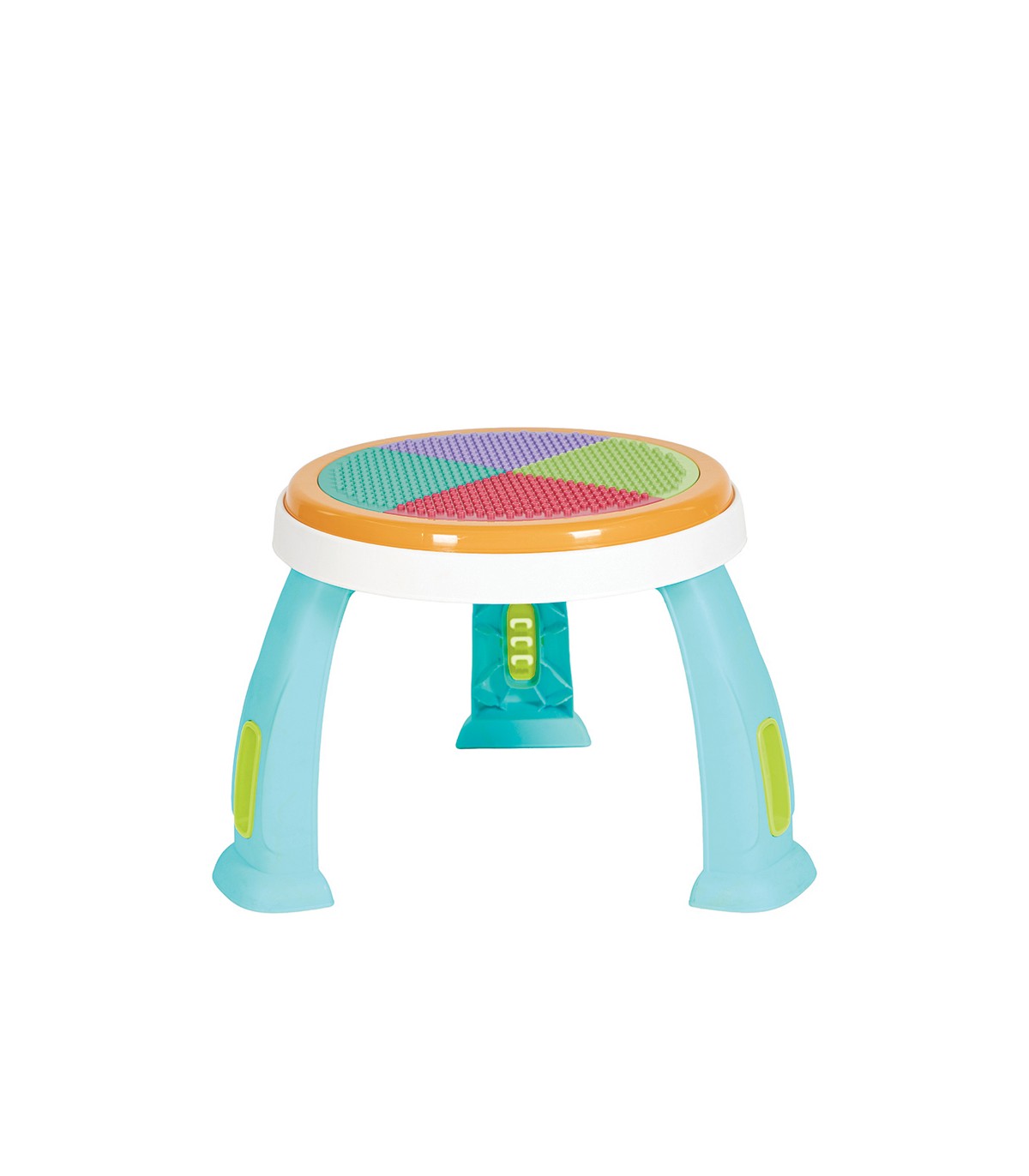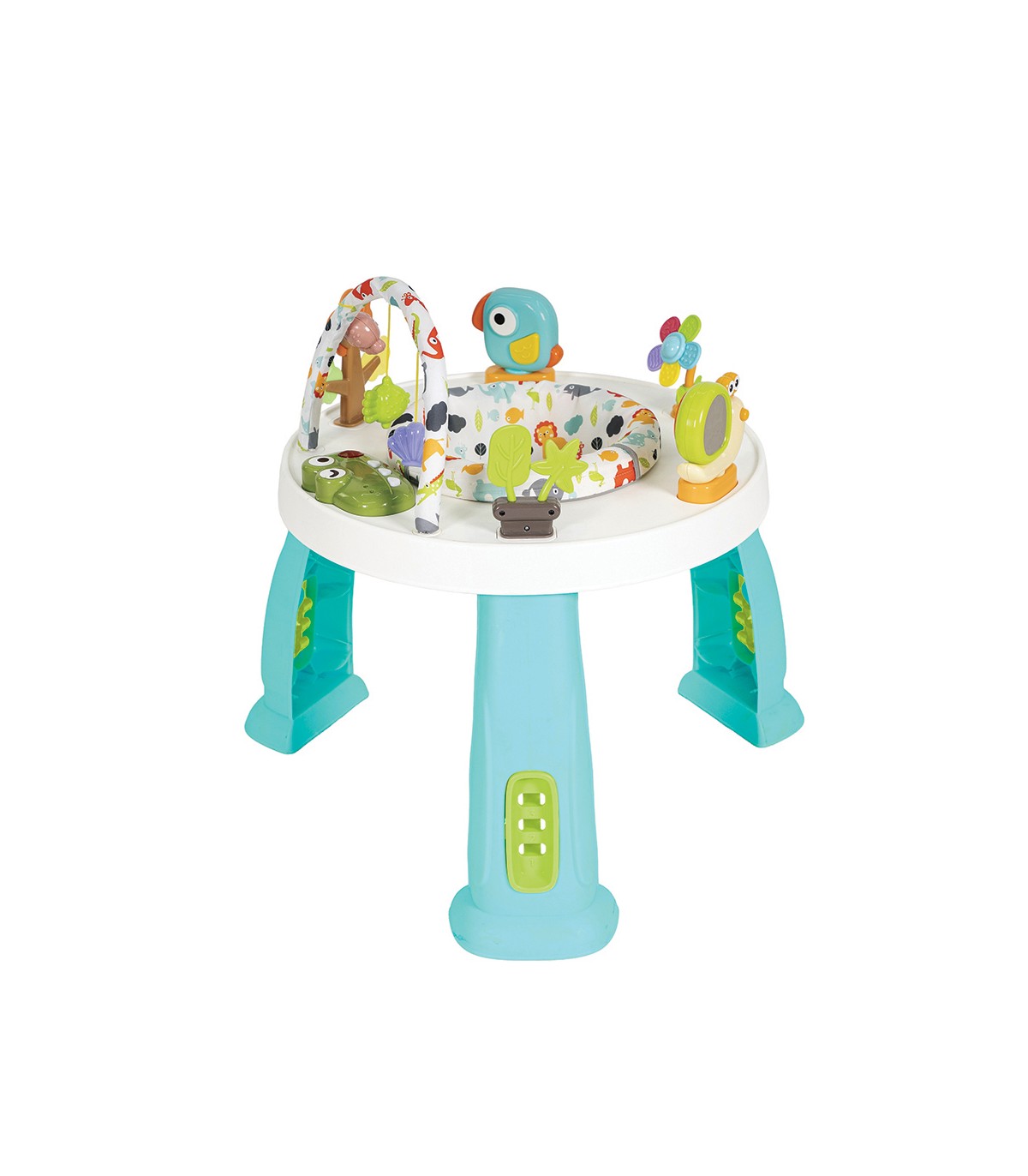- 2-in-1 activity center with a jumper that allows the child to bounce and play freely, and can also be used as a game table or building block table.