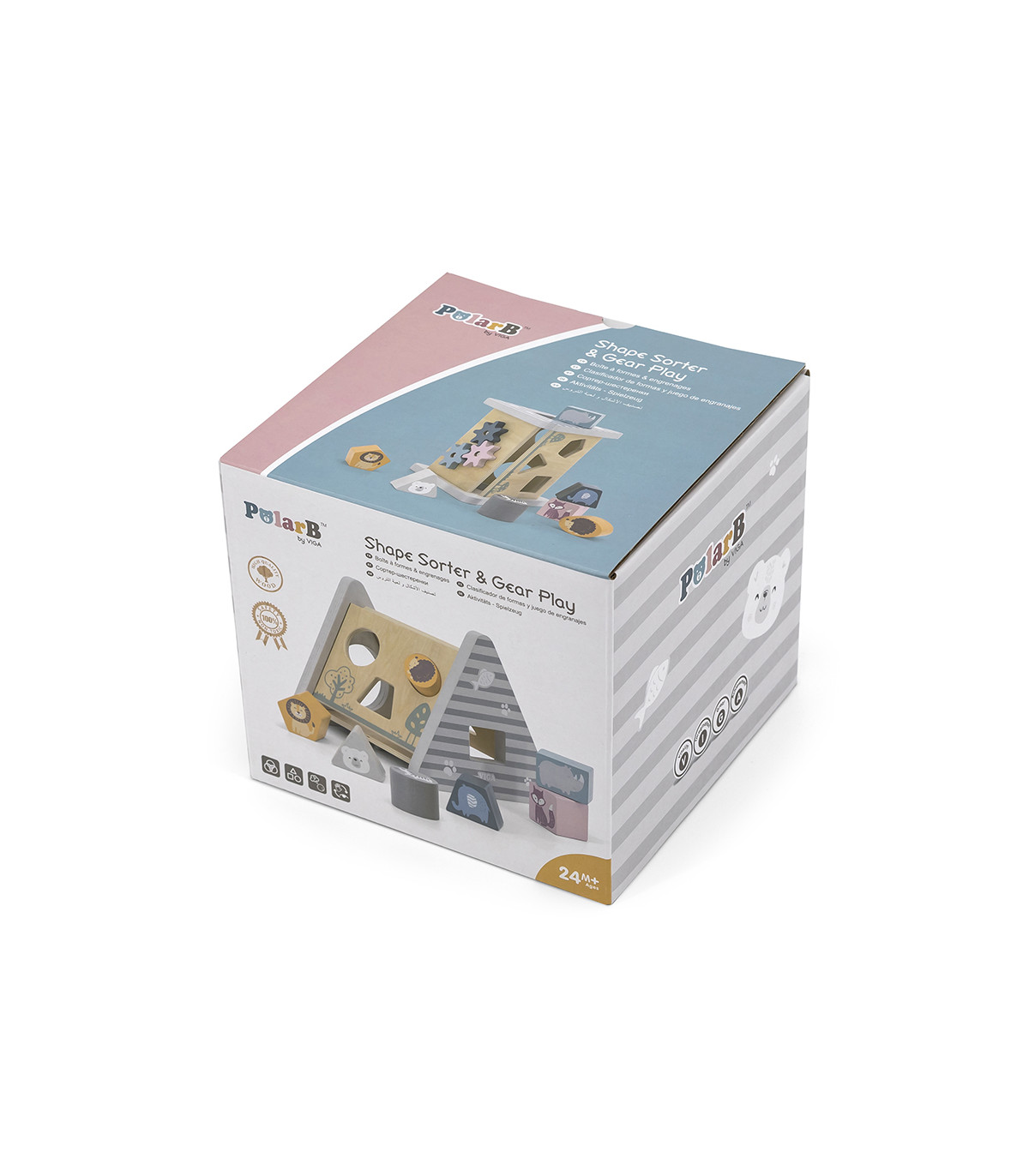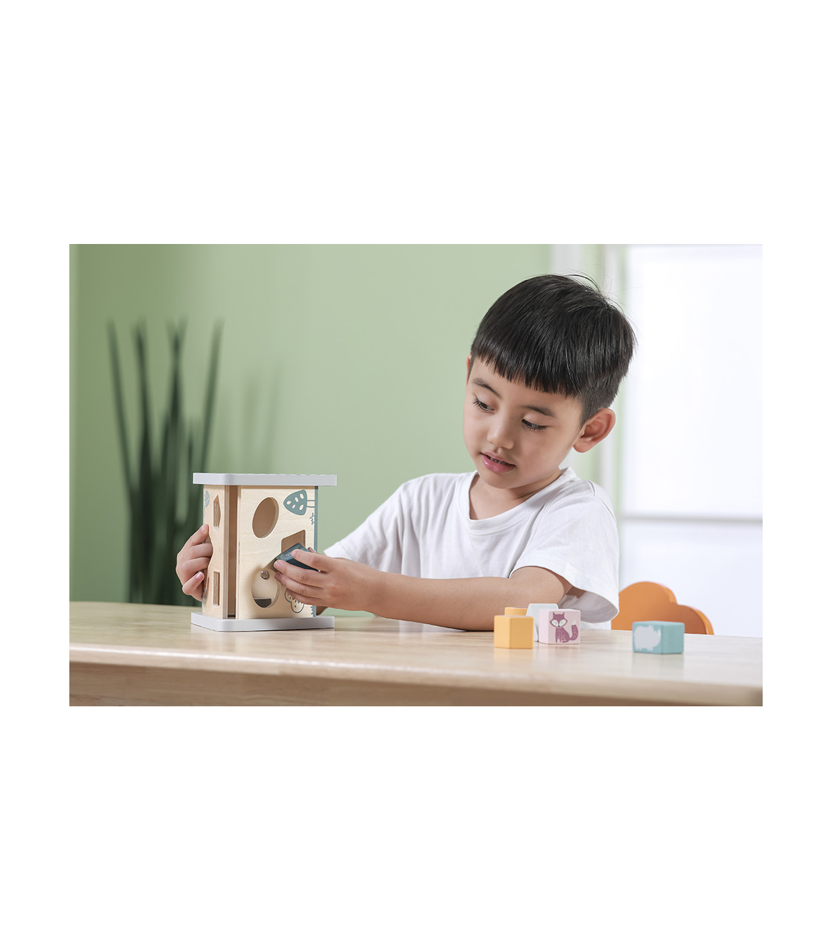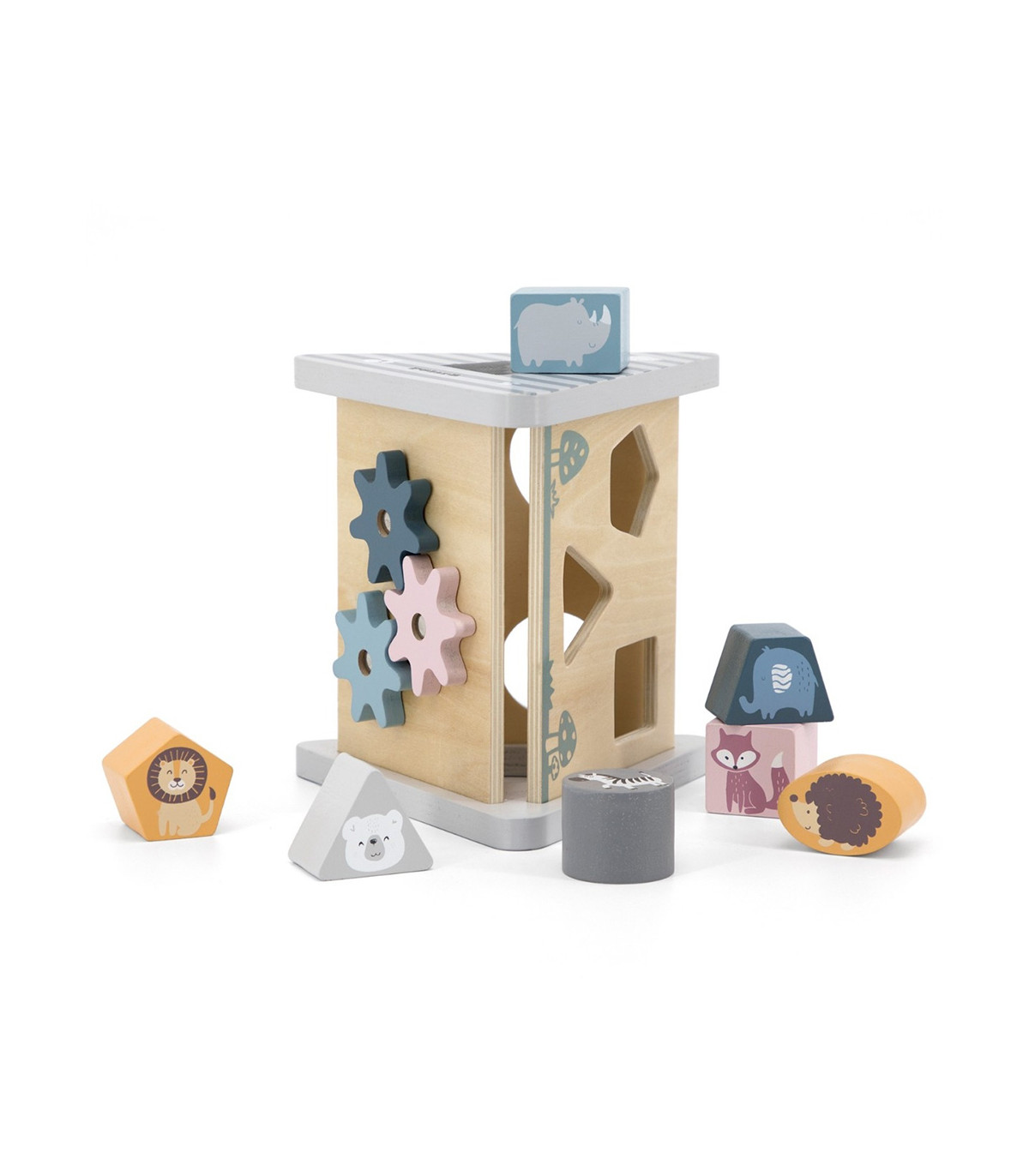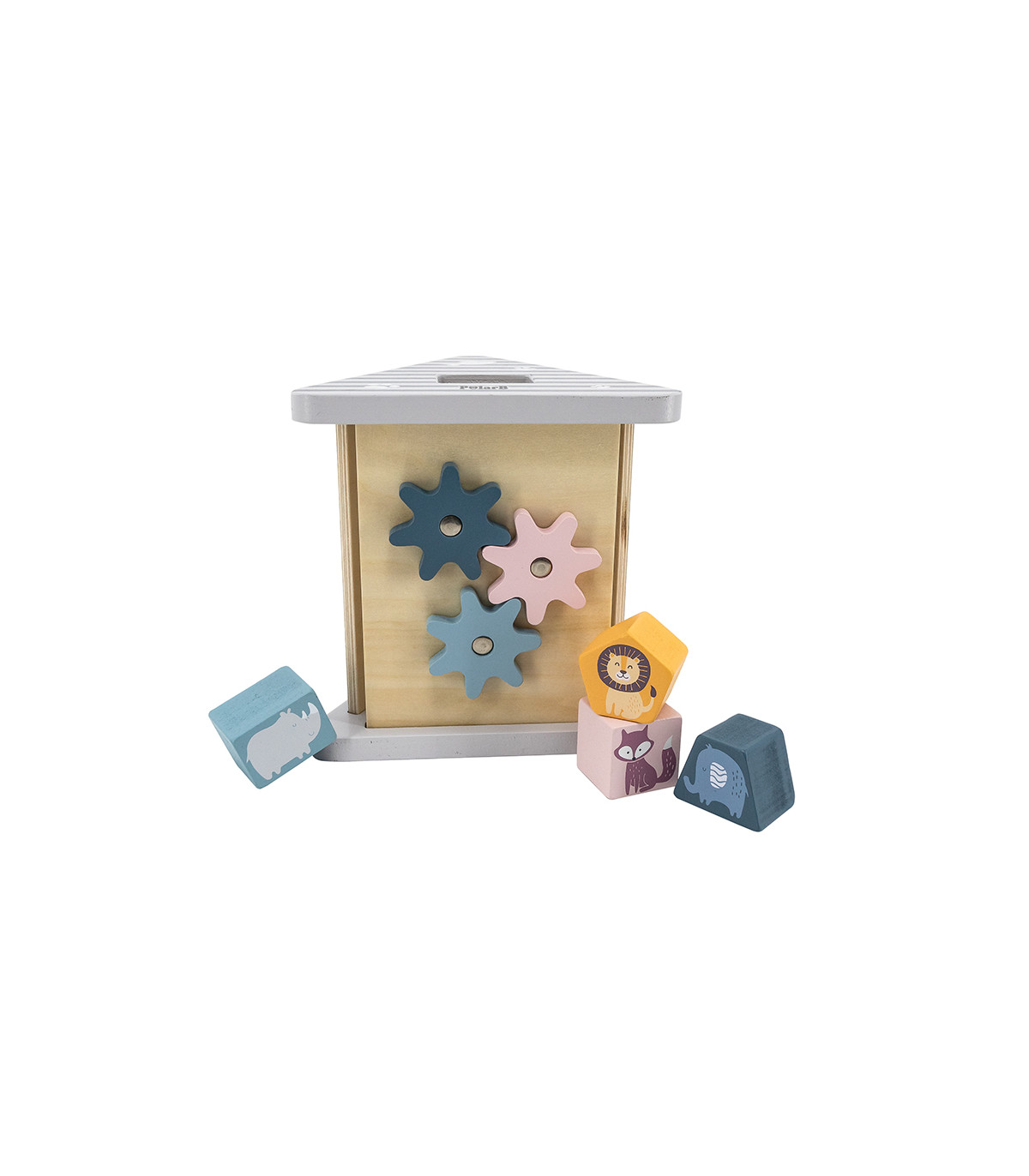 The learning triangle consists of 5 sides with 7 different shapes. The child must match the wooden blocks with the empty holes on the sides, thus working on shape recognition and hand-eye coordination skills. The wooden blocks feature different colors and animals so you can also learn colors and animals while having fun.