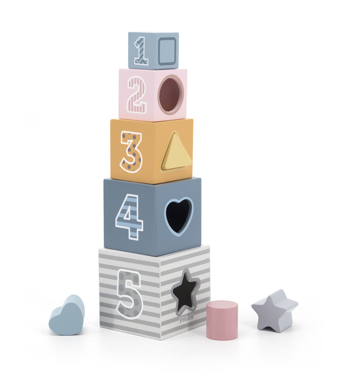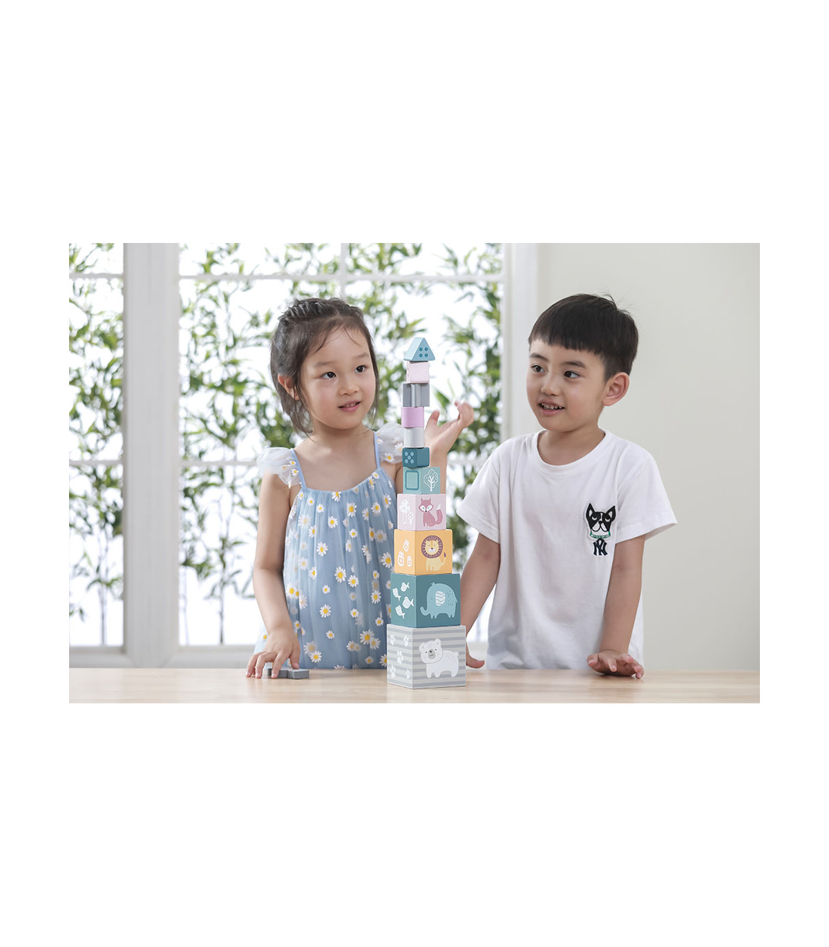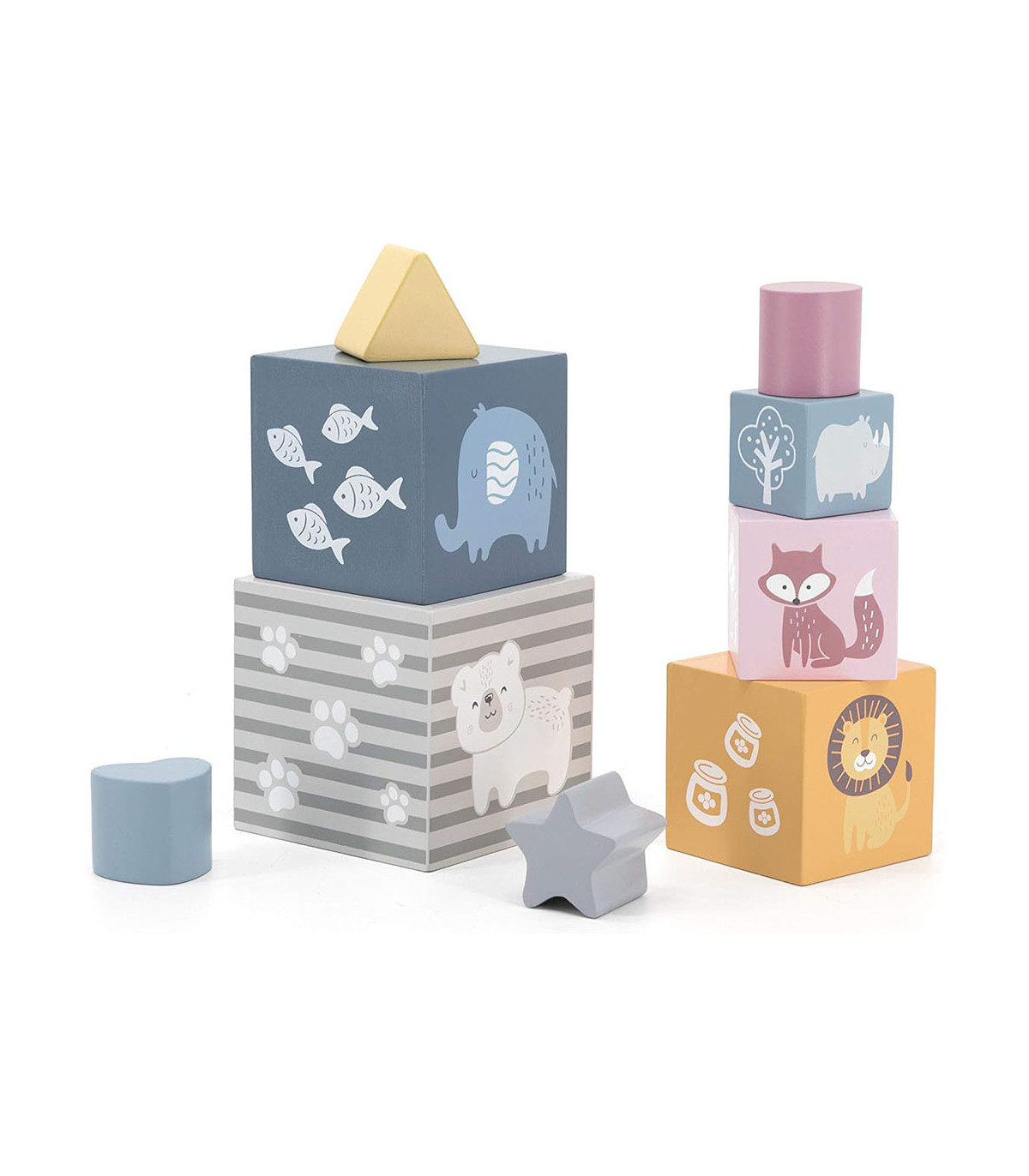 The nesting and stacking block game is fun and educational, so little ones learn while they play. With 5 different sized cubes and geometric holes for 4 blocks, kids can nest, stack and sort shapes while learning about numbers, shapes and different animals. This toy encourages visual motor skills, memory, shapes, colors, number skills and the child's attention.