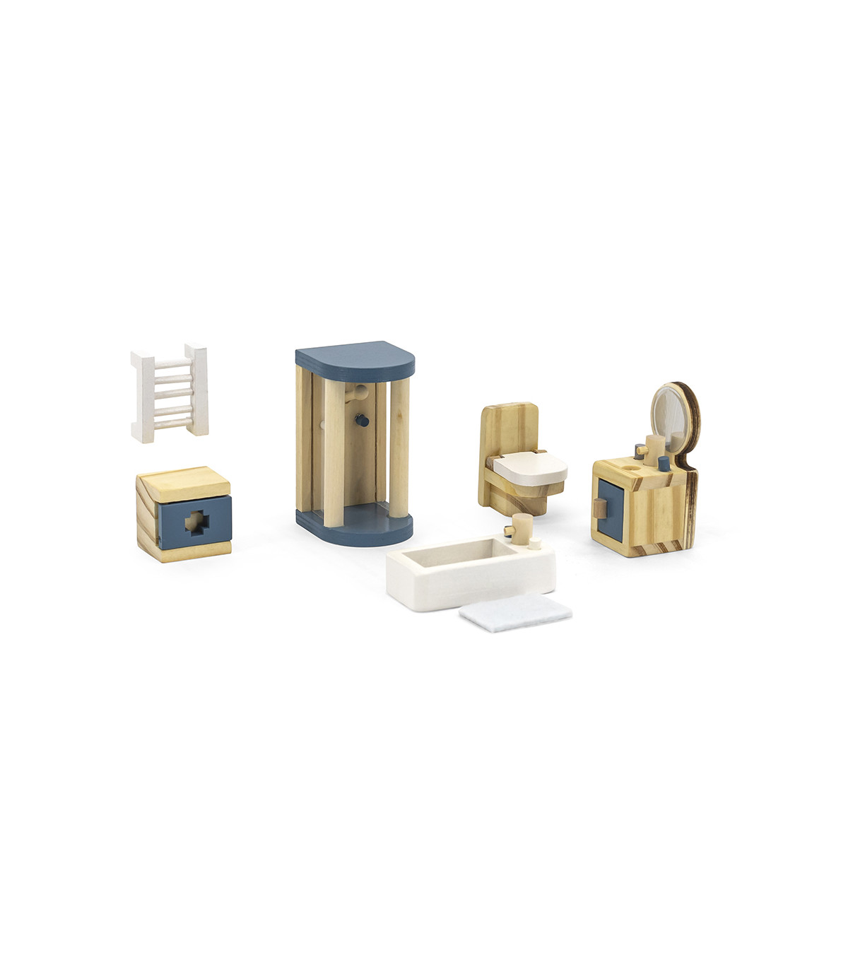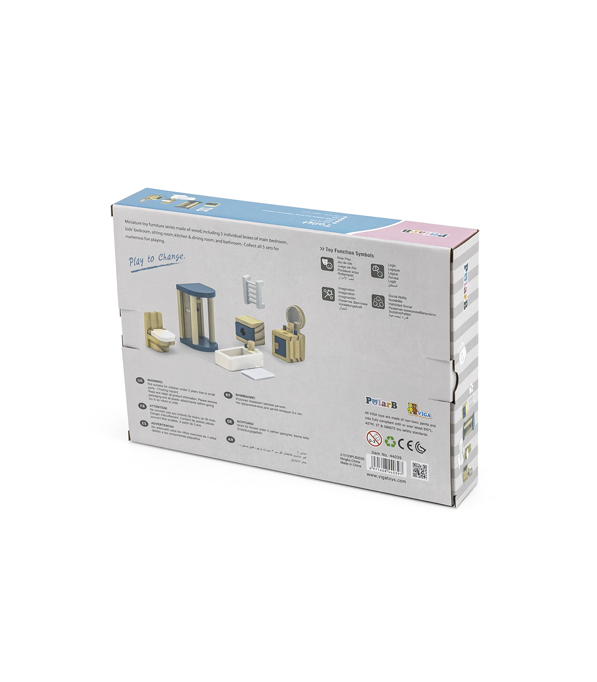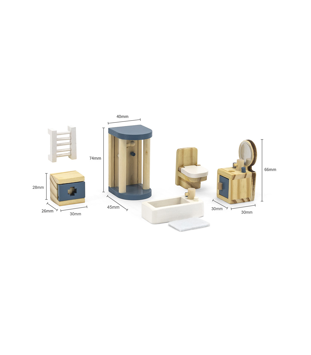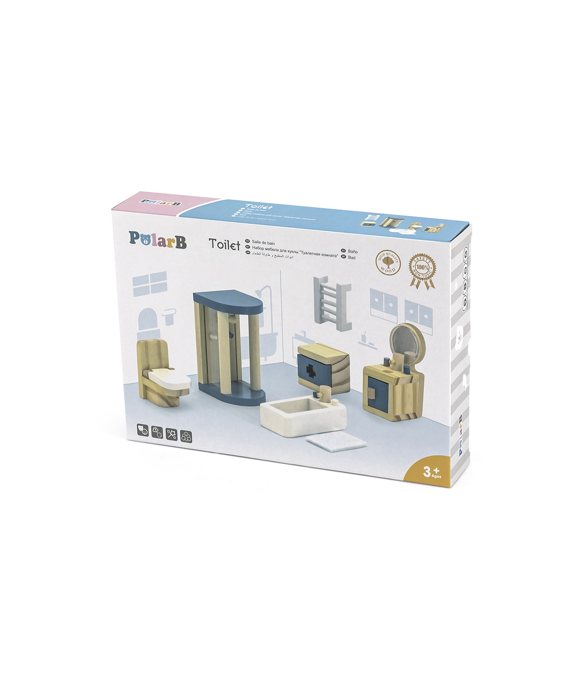 PolarB Wooden House Bathroom Wooden Furniture Set includes toilet, bathtub, shower, mirror cabinet, storage cabinet and towel rack. The set combines perfectly with the design of the rest of the rooms and the wooden house.