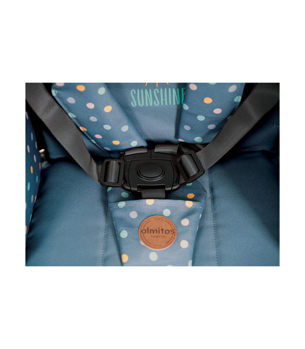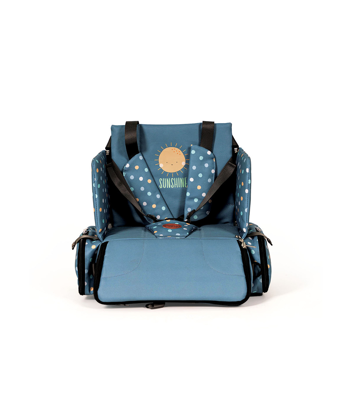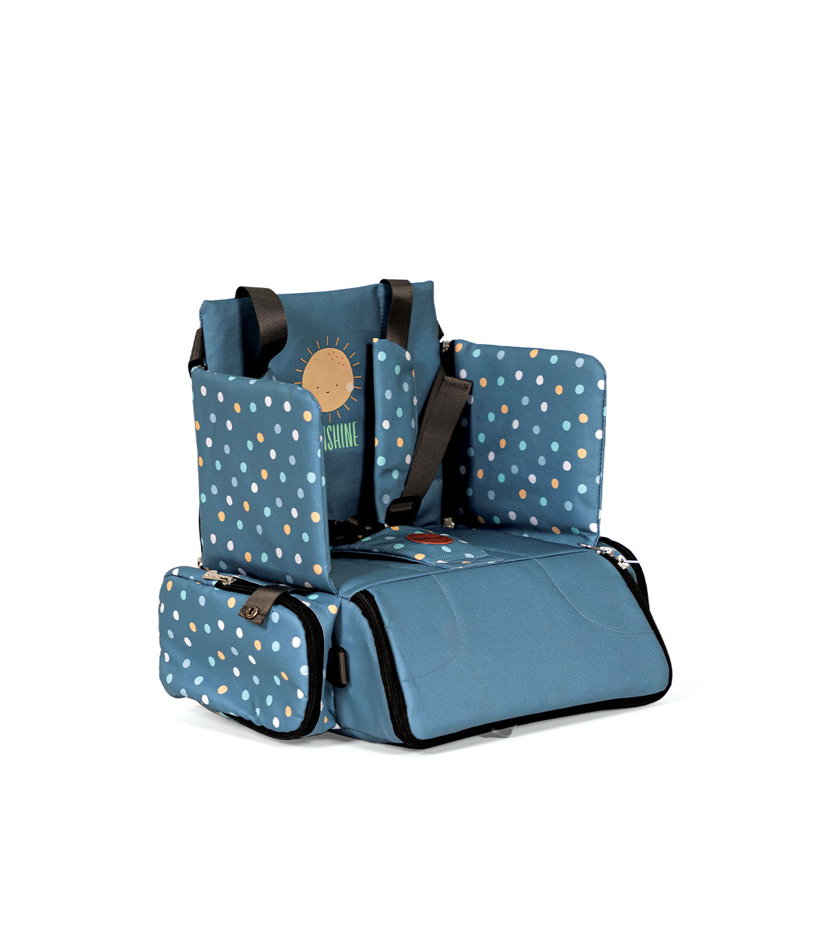 The foldable booster seat is lightweight and easy to carry thanks to its adjustable handle. With a 5-point safety harness and adjustable straps, it secures your child firmly in any chair. It includes convenient pockets for bibs and toys, and its rigid base provides comfortable support. Plus, it features an interior compartment to organize baby's essentials and is easily removed for optimal cleaning. Ideal for active families, it can be worn as a backpack or shoulder bag.