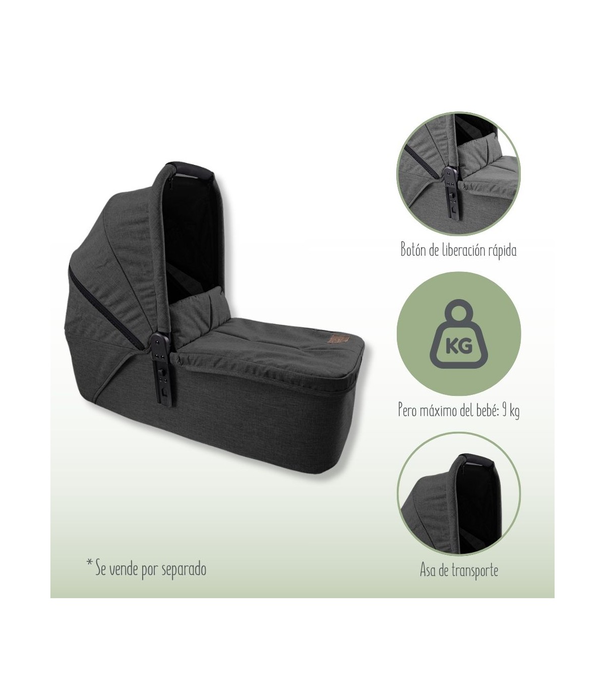 The double button quick release system allows for easy installation on the stroller, while the interior folding button on the canopy makes it easy to adjust. The practical magnetic footmuff and the additional carrying handle are details that complete the features of this versatile carrycot.