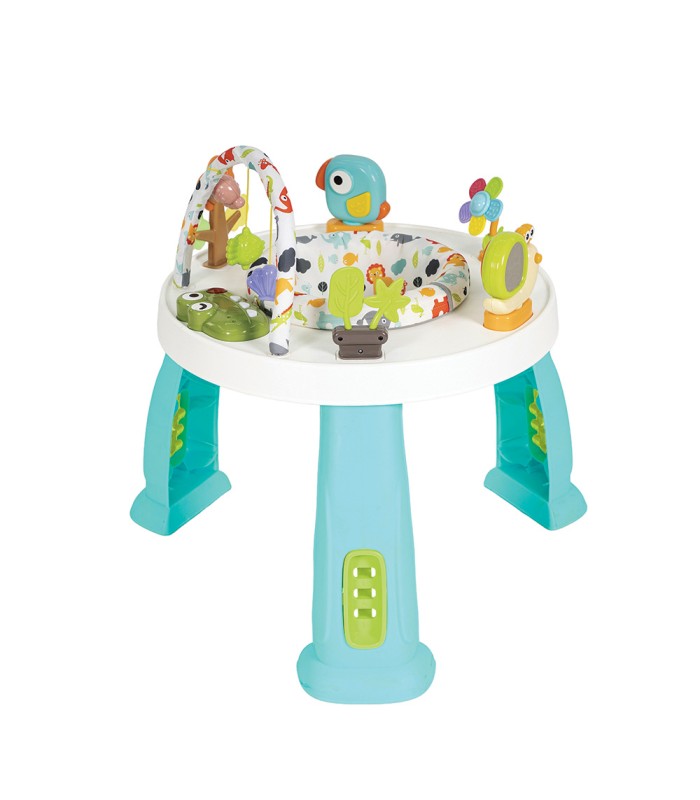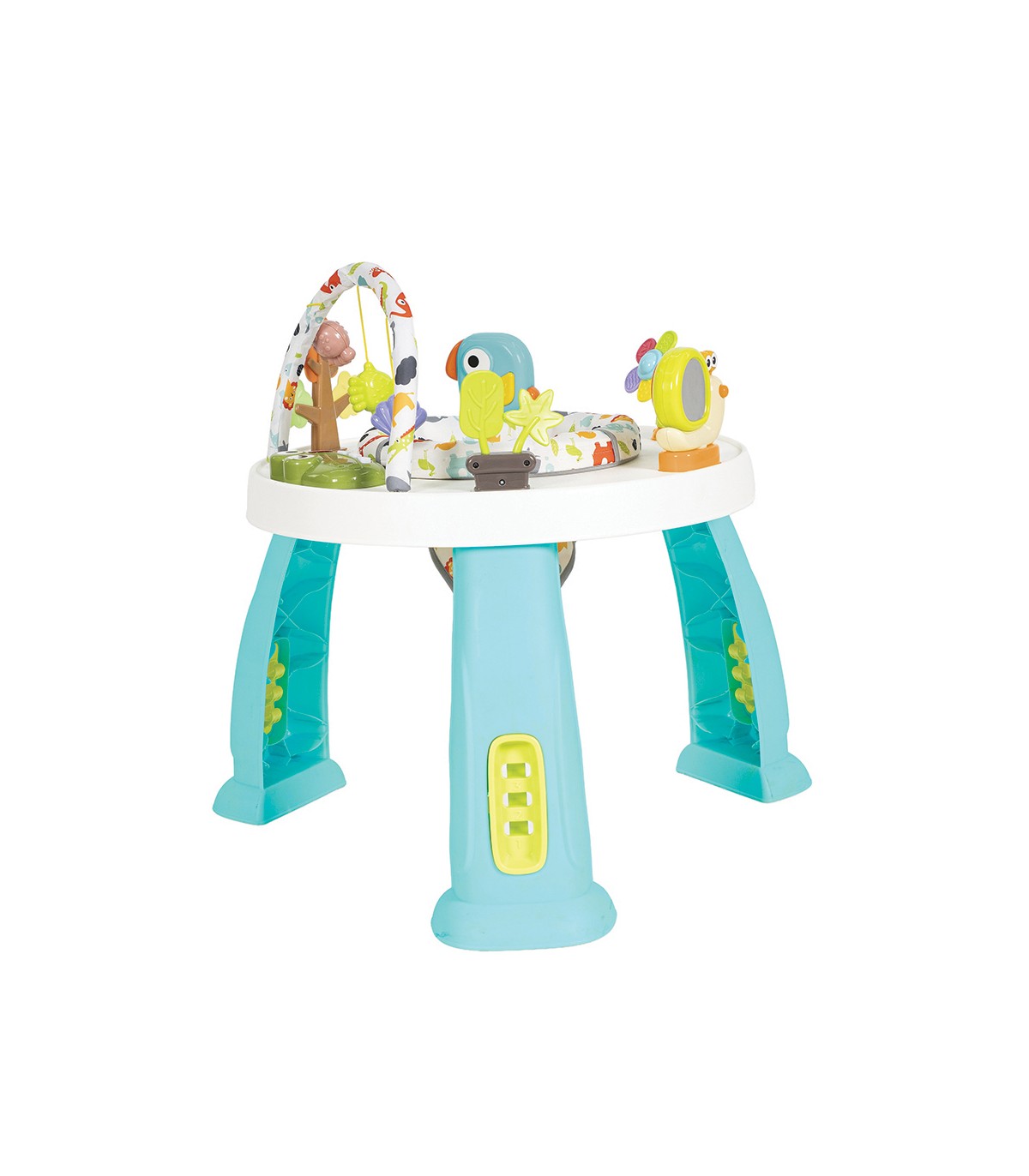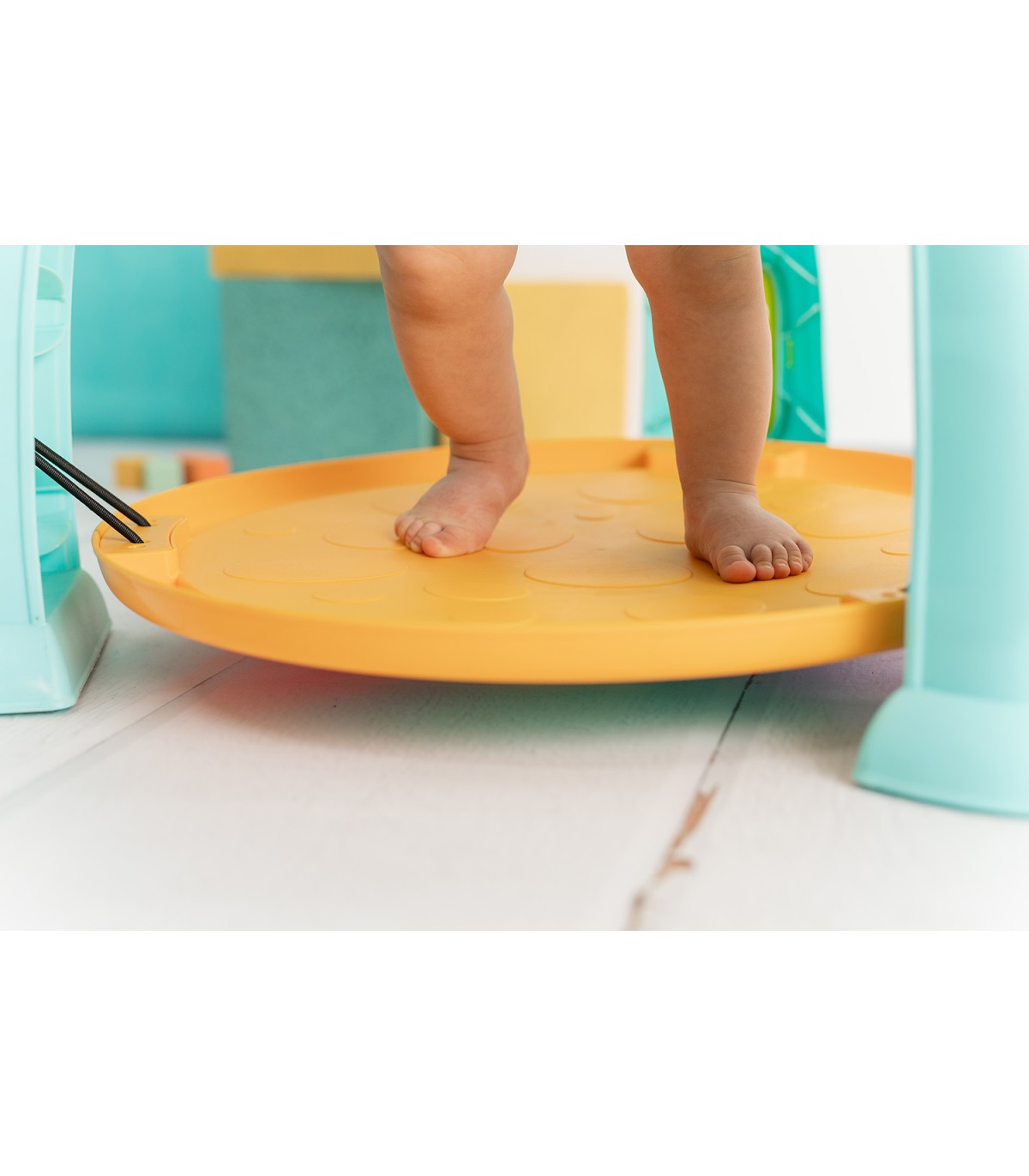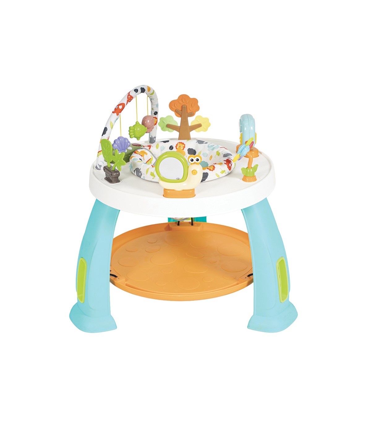 El Centro de Actividades 2 en 1 que crece con tu bebé: combina un saltador con rebote para fortalecer sus piernas y una mesa de juegos sensorial giratoria 360º.