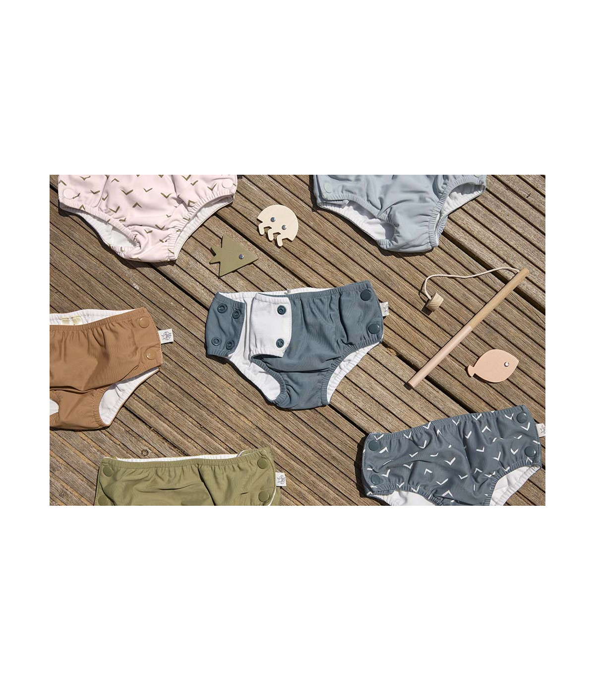 Pañal de baño reutilizable con botones de presión fabricado en poliéster reciclado. Ideal para unas vacaciones en la playa o un chapuzón en la piscina. La alternativa ecológica a los pañales de natación desechables.