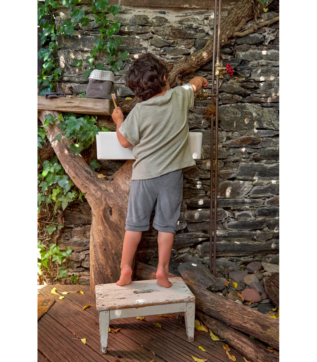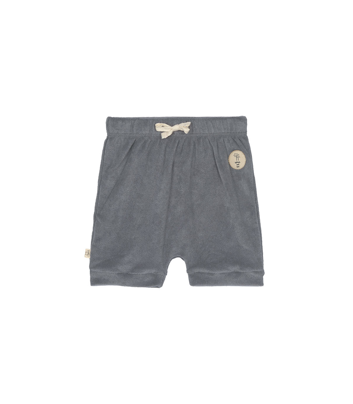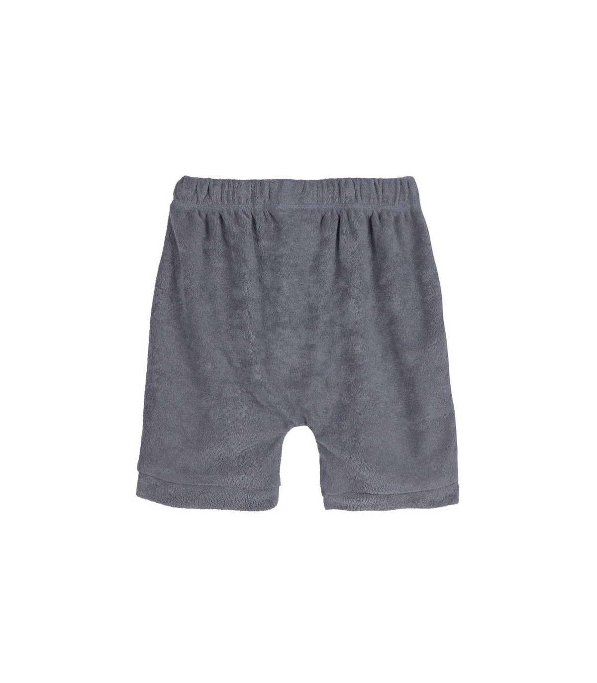 Los pantalones cortos para niños de color rojo óxido están confeccionados con una tela de rizo especialmente suave hecha de algodón orgánico y poliéster reciclado. La cintura elástica asegura un buen ajuste, mientras que el corte cómodo ofrece suficiente espacio para el pañal.