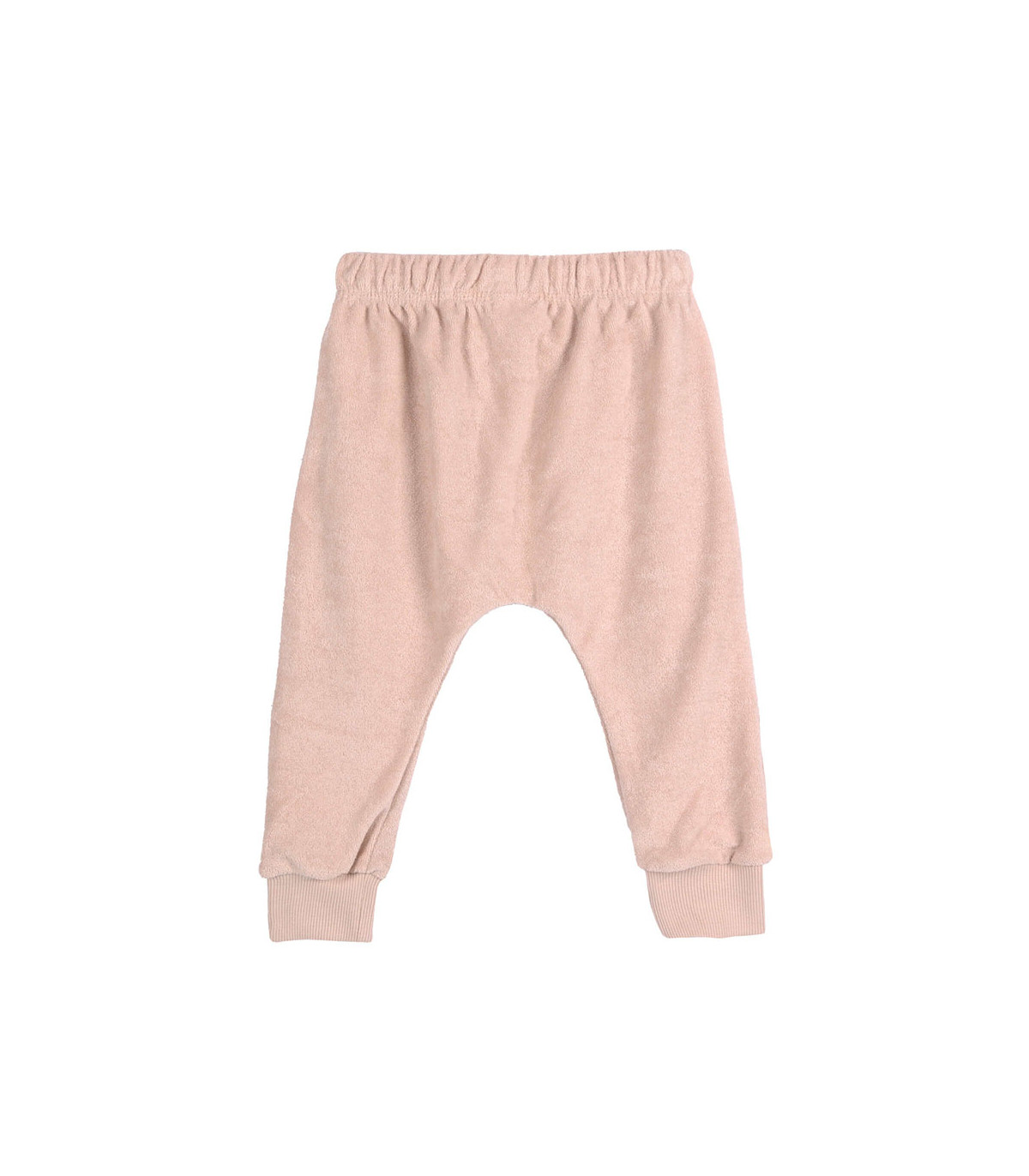 Los pantalones de color rojo óxido están confeccionados con una tela de rizo especialmente suave hecha de algodón orgánico y poliéster reciclado.
