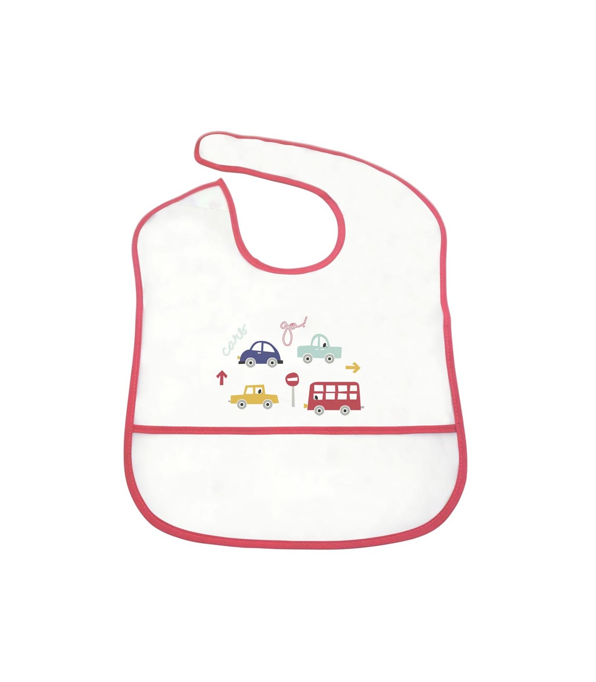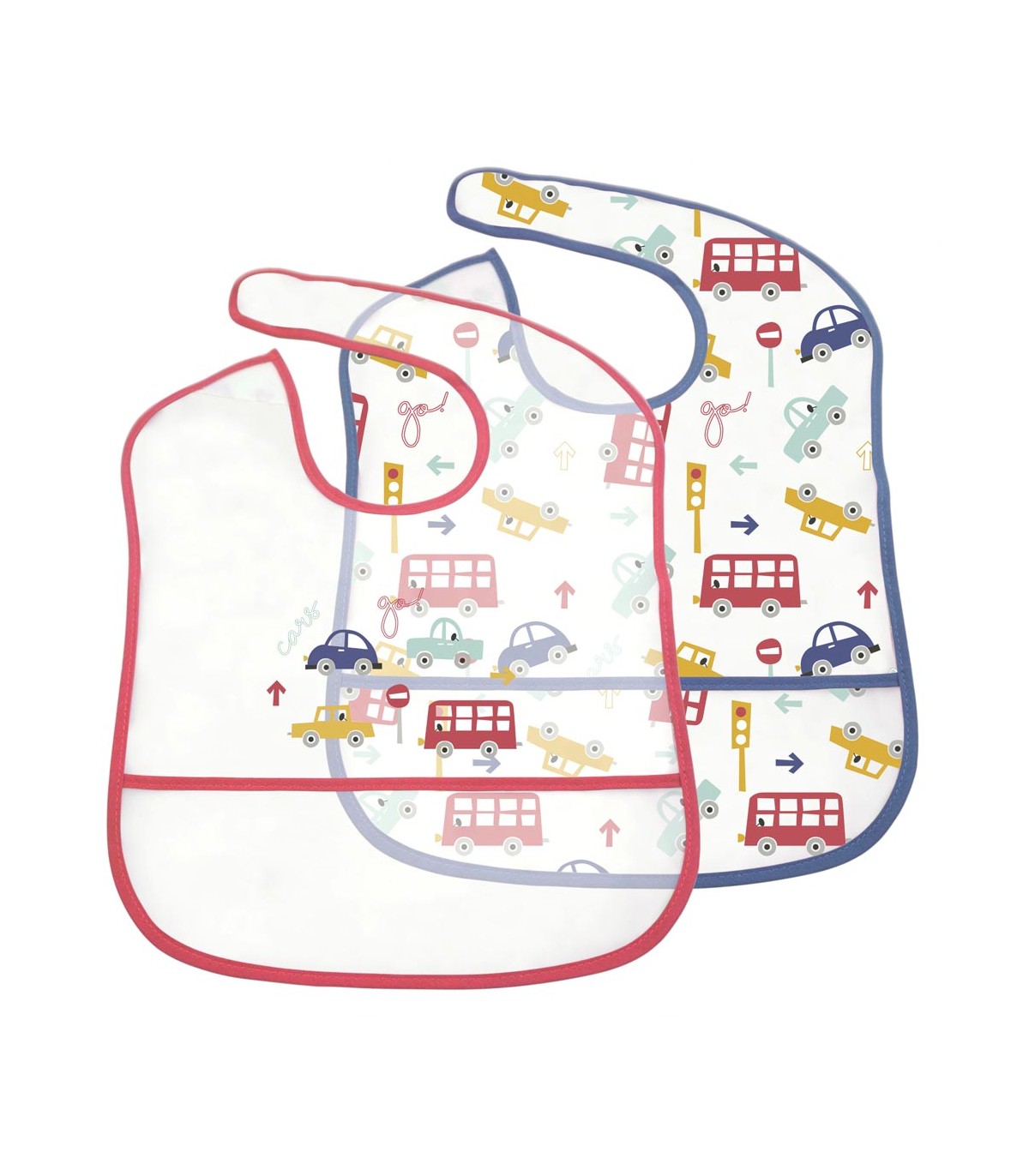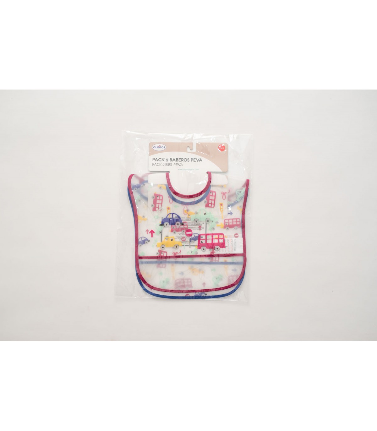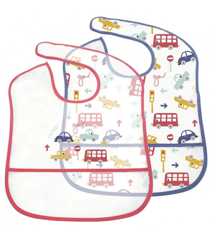 Conjunto de dois babadores de peva com bolso e ajuste de velcro.