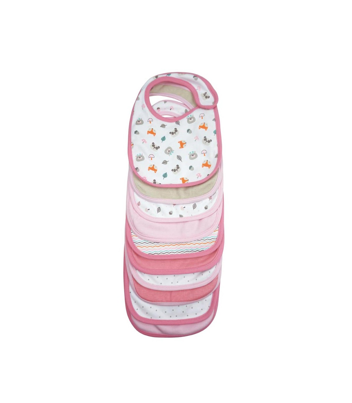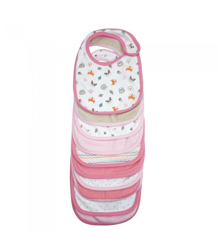 Conjunto de dez babadores de algodão macio com fecho de velcro.