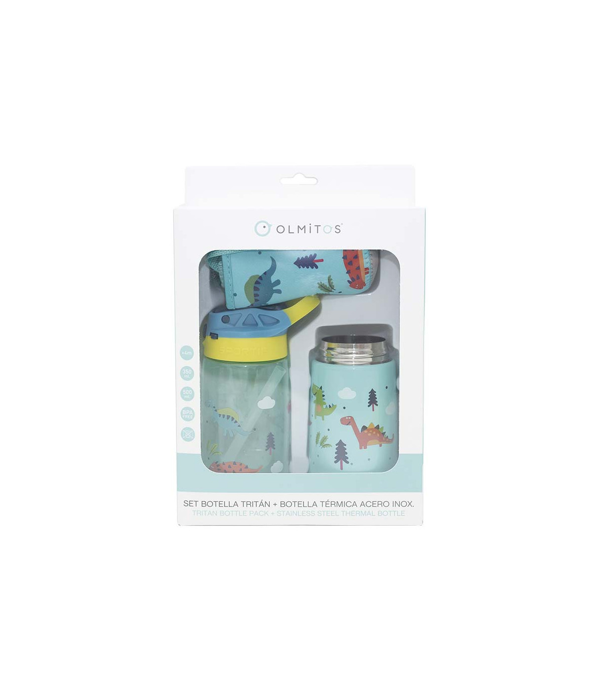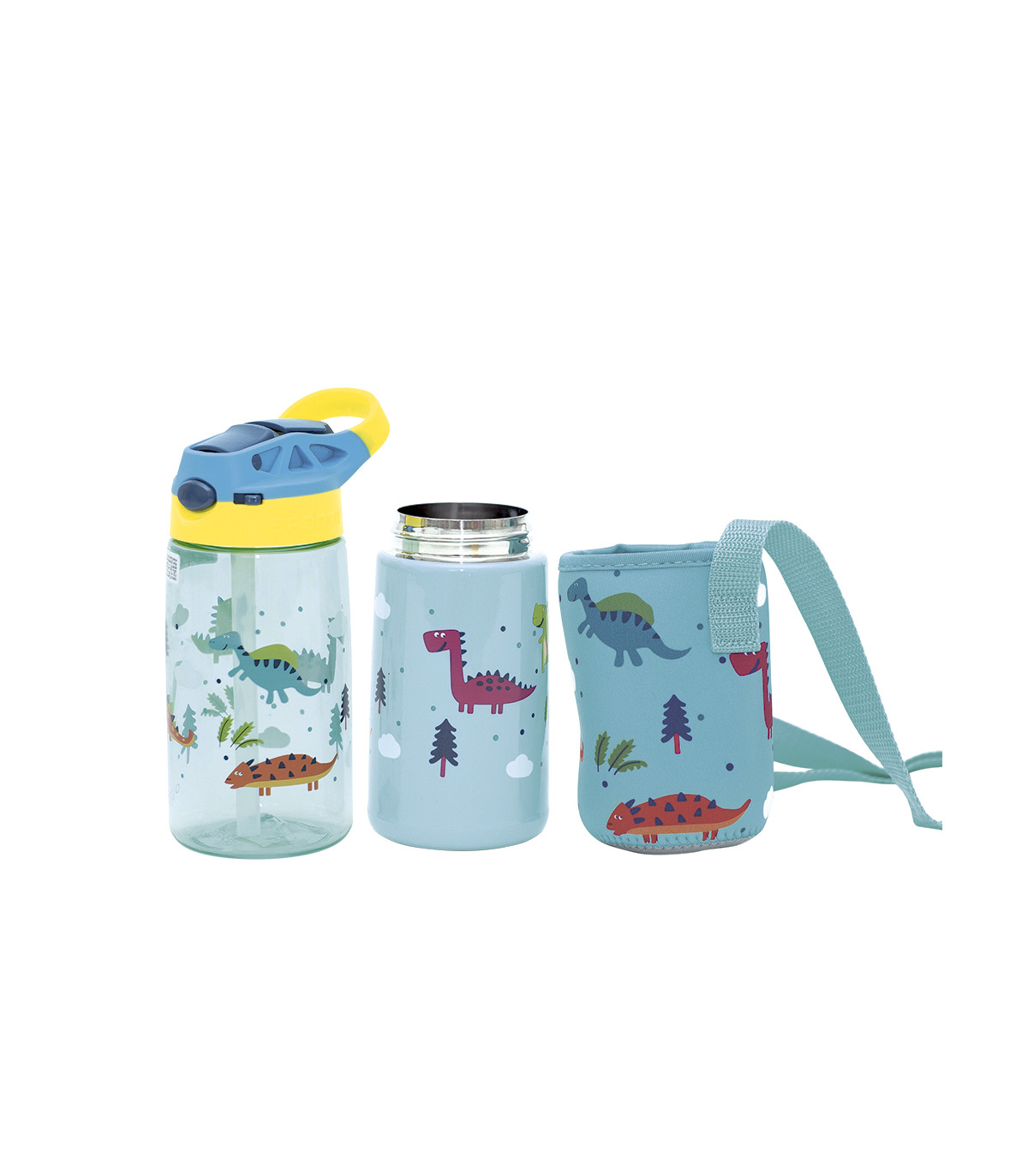 Garrafa infantil de duplo frasco para usar conforme a conveniência. De tritán para menor peso ou de aço, para manter a temperatura, cada uma com uma capacidade diferente. A garrafa inclui uma bolsa de transporte de neoprene e um bocal de silicone largo.