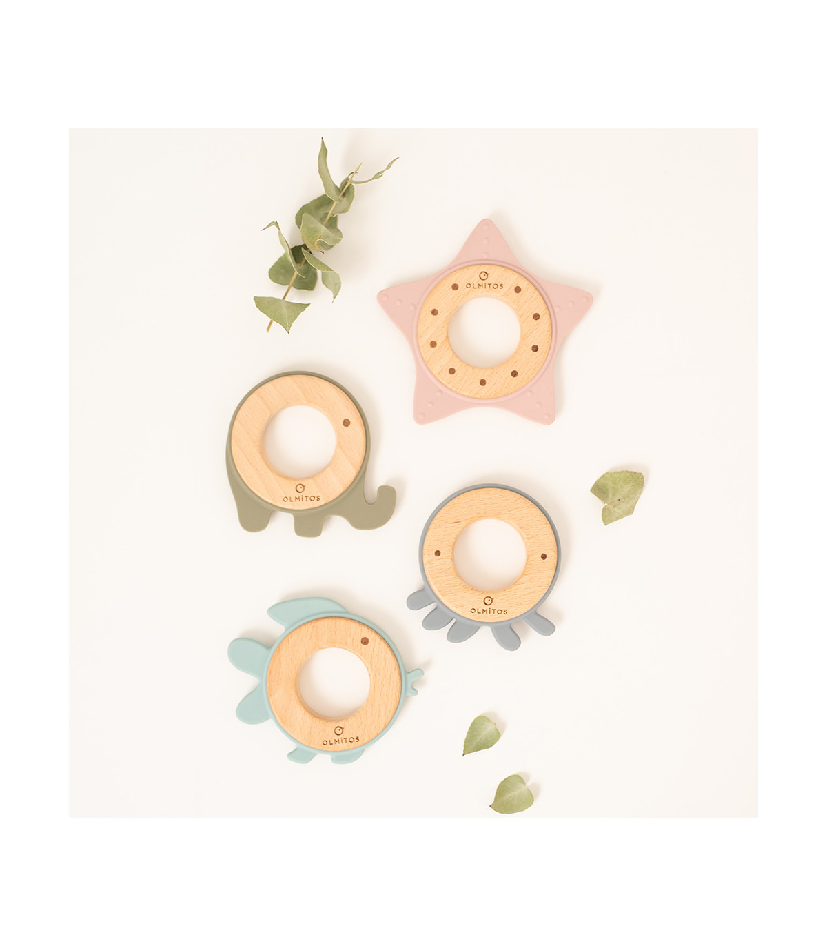 Argola de dentição de madeira de faia e exterior de silicone em forma de animais marinhos que ajuda no processo de dentição do bebê.