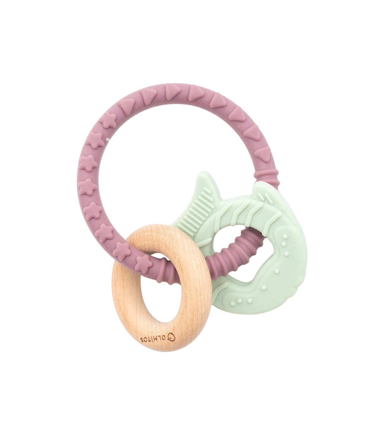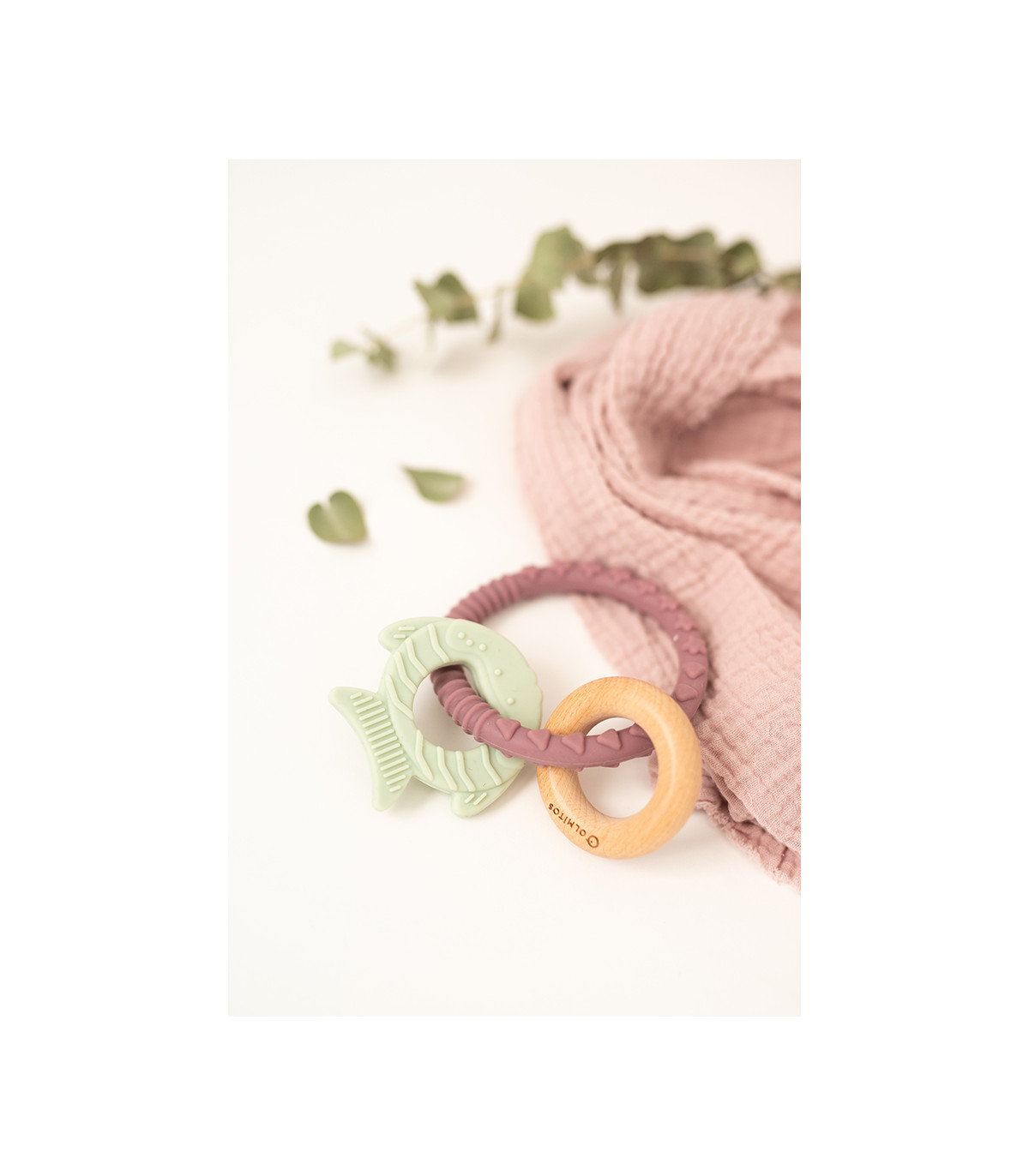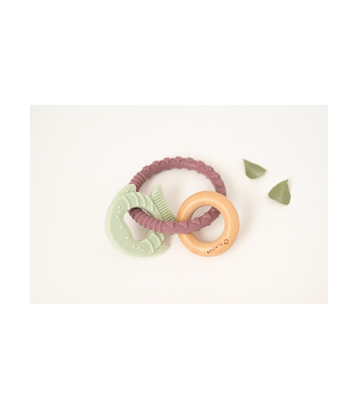 Mordedor de silicone grau alimentício e madeira de faia que combina diferentes elementos e texturas para aliviar a dor dos primeiros dentes do bebê e facilitar a aderência às mãos pequenas.