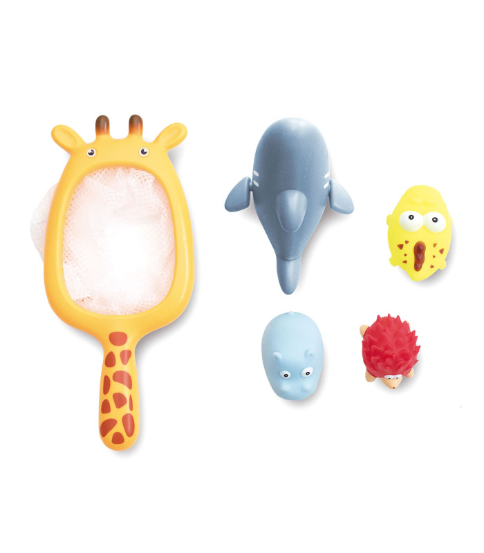 Conjunto de 5 brinquedos de banho composto por uma rede de pesca e 4 animaizinhos para a criança brincar de pescar durante o banho. Perfeito para estimular o jogo imaginativo e a destreza manual.