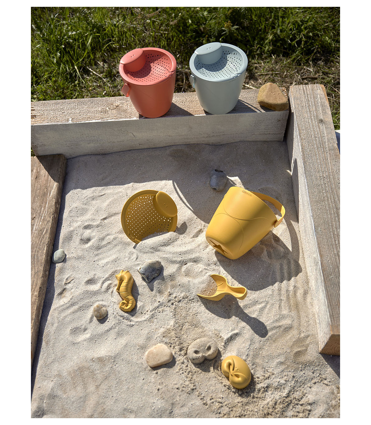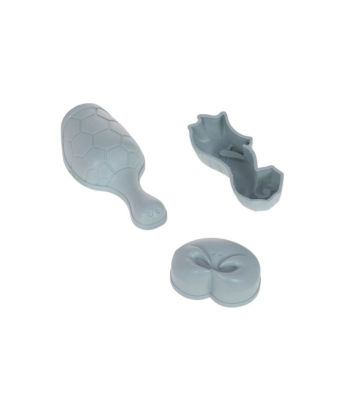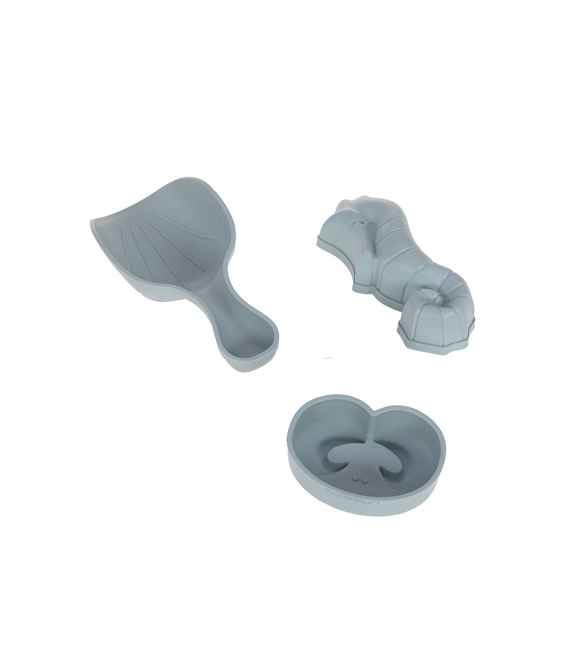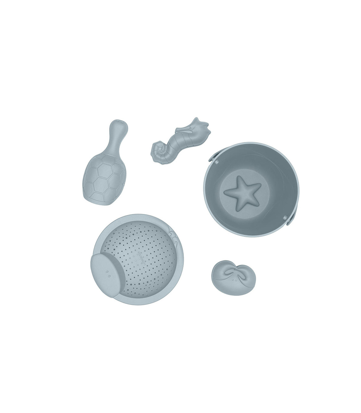 - Composto por: balde com alça, dois moldes (um com forma de cavalo marinho e outro com forma de caranguejo), uma pá com forma de tartaruga e um coador com forma de polvo.