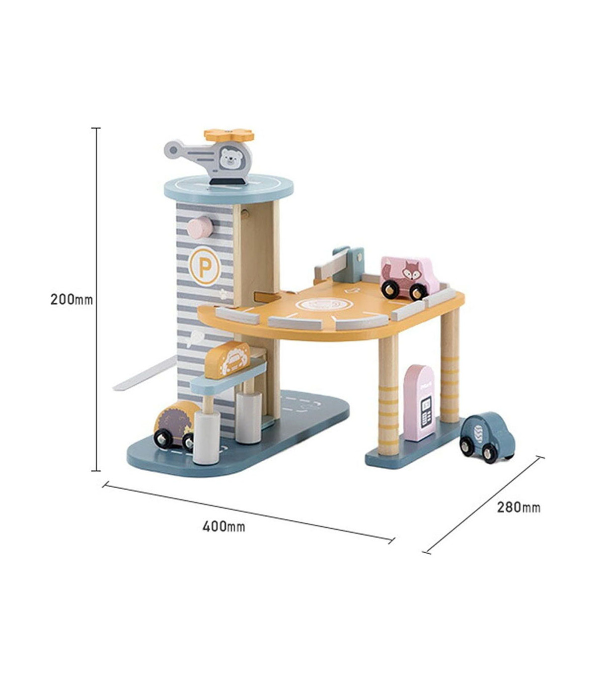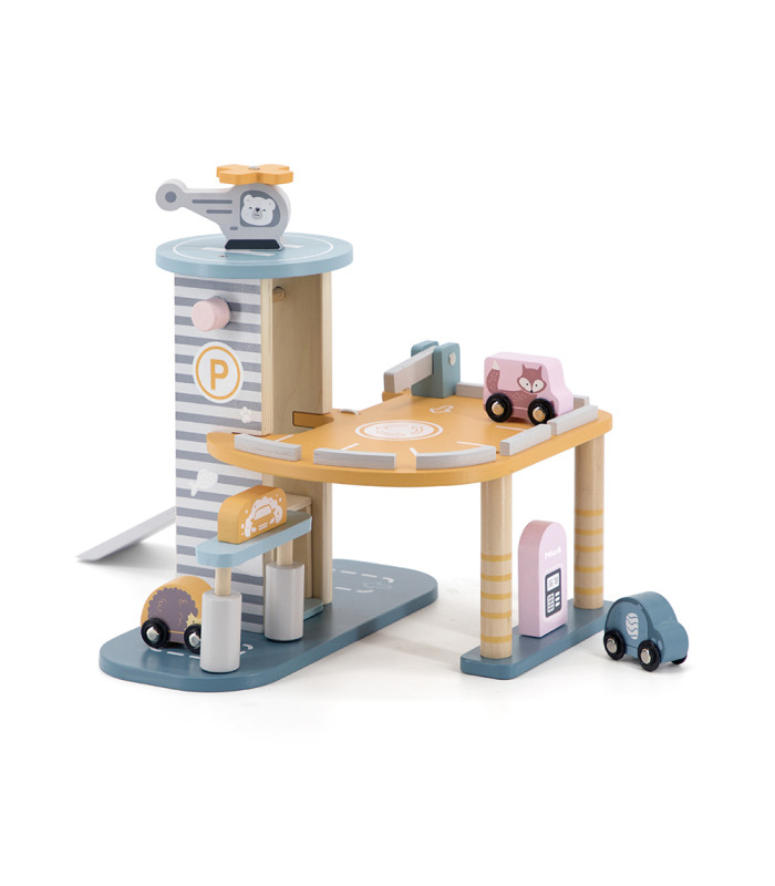 O estacionamento de madeira é o brinquedo ideal para os amantes de carros. Este estacionamento de três andares possui um heliporto, uma estação de lavagem de carros, um posto de gasolina, uma rampa e um elevador. Não é apenas divertido, mas também educativo. Ajuda a desenvolver a imaginação, o pensamento, a coordenação motora e as habilidades sociais das crianças. Os pequenos criarão suas próprias histórias enquanto se divertem.
