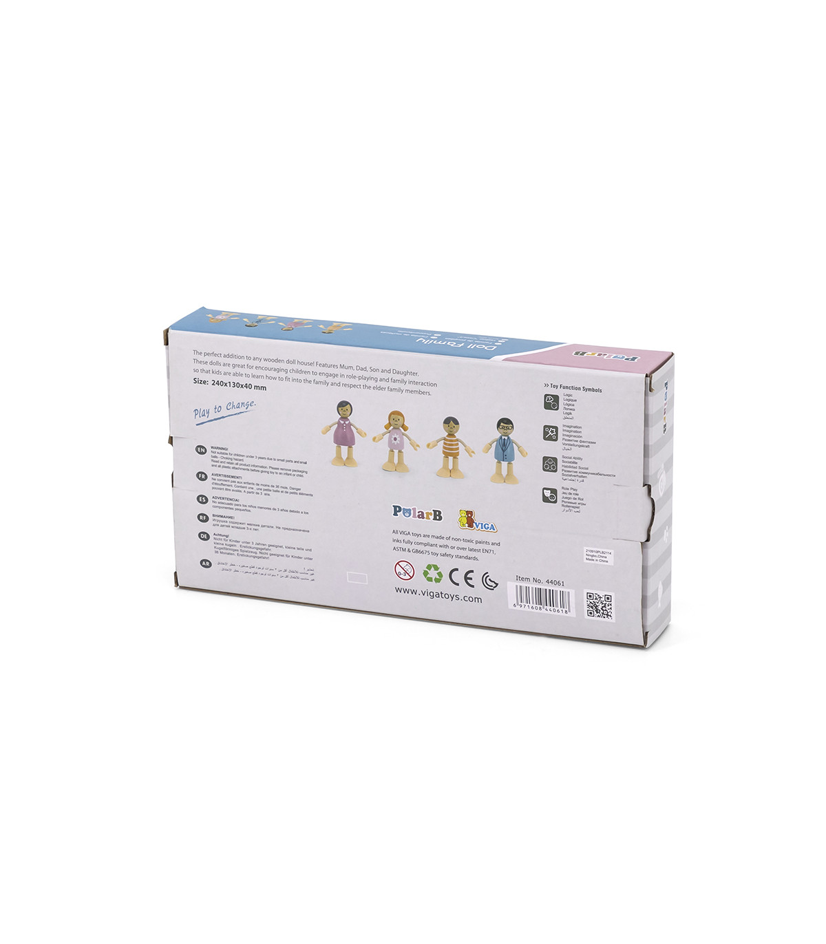 Esta família de bonecos de madeira, composta por mãe, pai, filho e filha, é o complemento perfeito para qualquer casa de bonecas. Ideal para motivar as crianças a participar em jogos de faz de conta e interação familiar. Os bonecos têm braços e pernas móveis, o que os torna fáceis de posicionar e dobrar em várias posições.