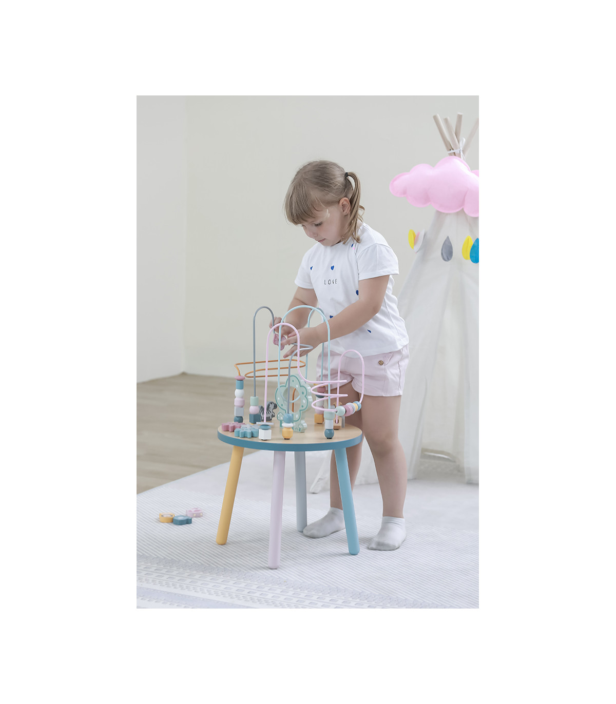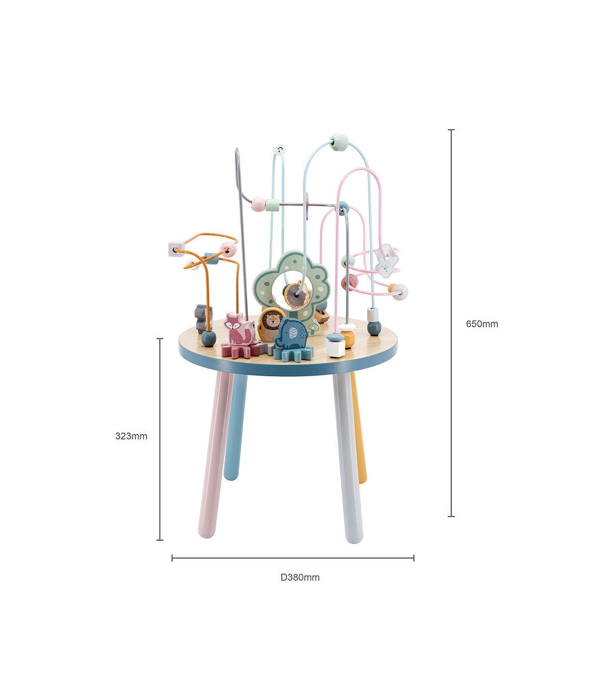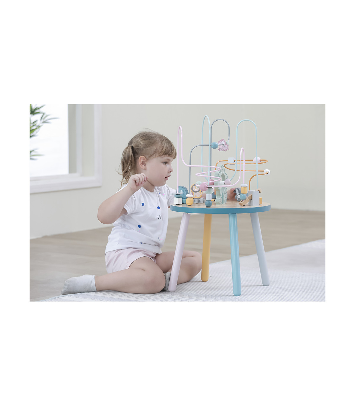 O labirinto de arame da mesa de jogo inclui contas, blocos de madeira, engrenagens e figuras de animais que percorrerão a montanha-russa, entretendo os mais pequenos durante horas. Além de se divertirem, as crianças desenvolverão o pensamento, a imaginação, a coordenação olho-mão, o bem-estar emocional e aprenderão as cores e as formas.