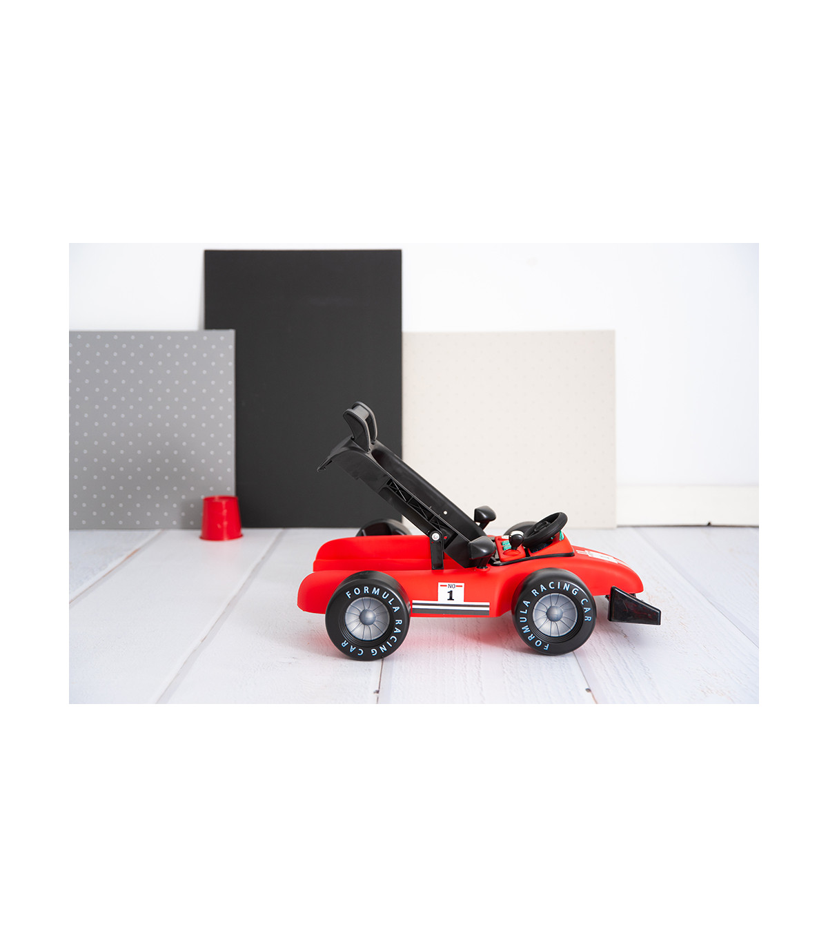 - Rodas dianteiras de borracha giratórias e rodas traseiras que só avançam para frente. As rodas traseiras têm velocidade ajustável que pode ser modificada de acordo com a força da criança.