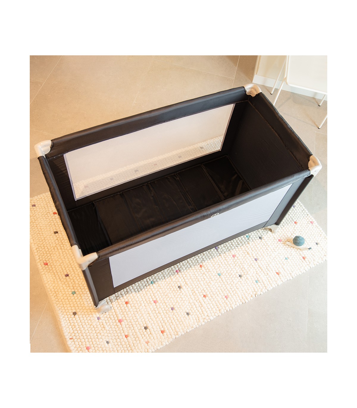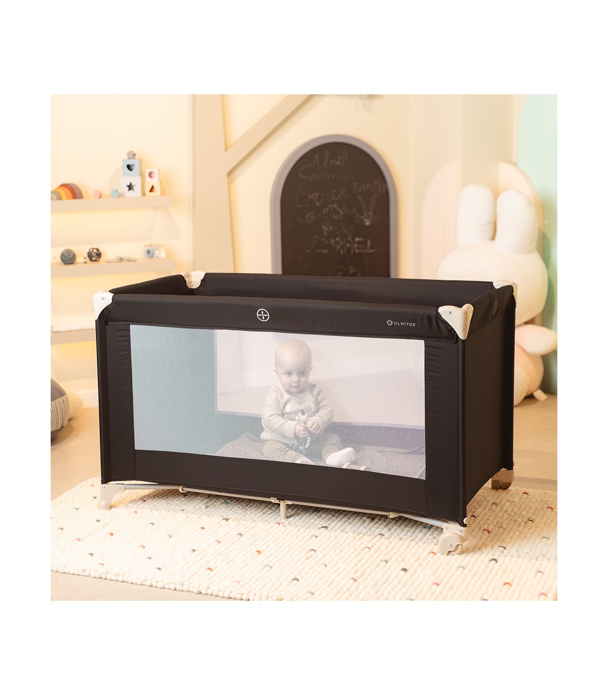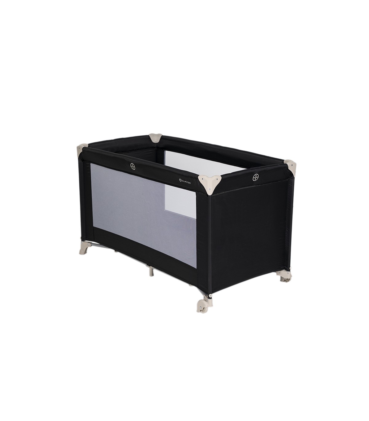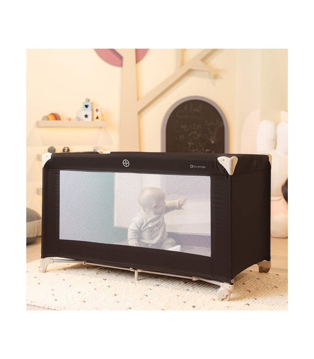 Berço de viagem com rodas para facilitar o movimento e com travões de segurança. As paredes são de rede para melhorar a ventilação e permitir que o bebé veja o exterior. É muito fácil de transportar graças à sua dobra compacta e à bolsa de transporte, e é confortável devido ao colchão incluído.