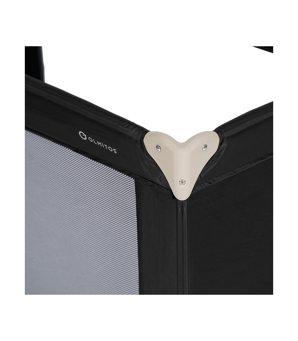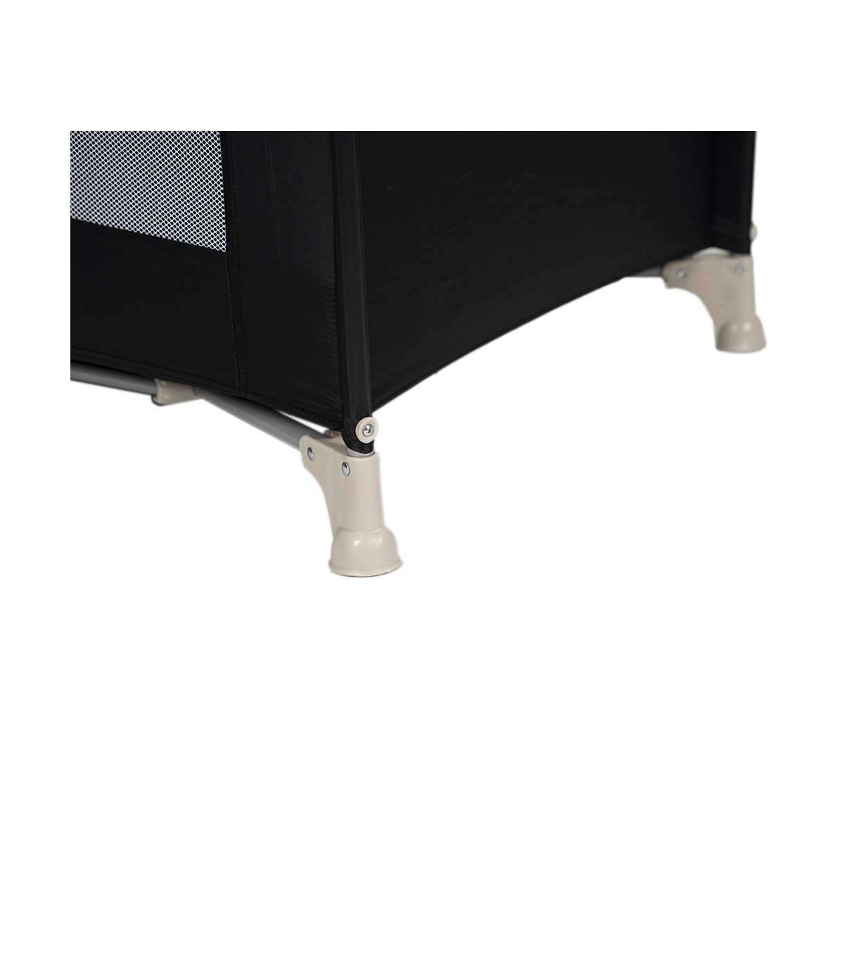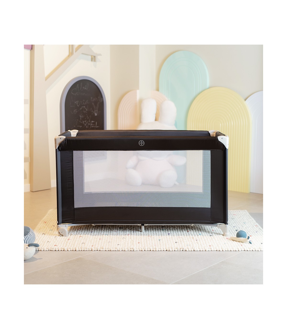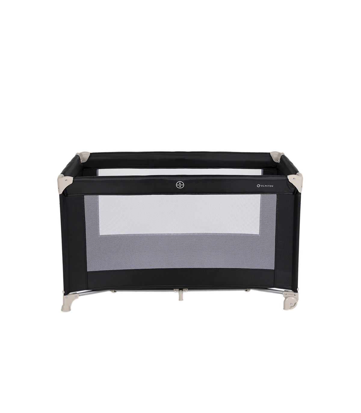 Berço de viagem com rodas para facilitar o movimento e com travões de segurança. As paredes são de rede para melhorar a ventilação e permitir que o bebé veja o exterior. É muito fácil de transportar graças à sua dobra compacta e à bolsa de transporte, e é confortável devido ao colchão incluído.