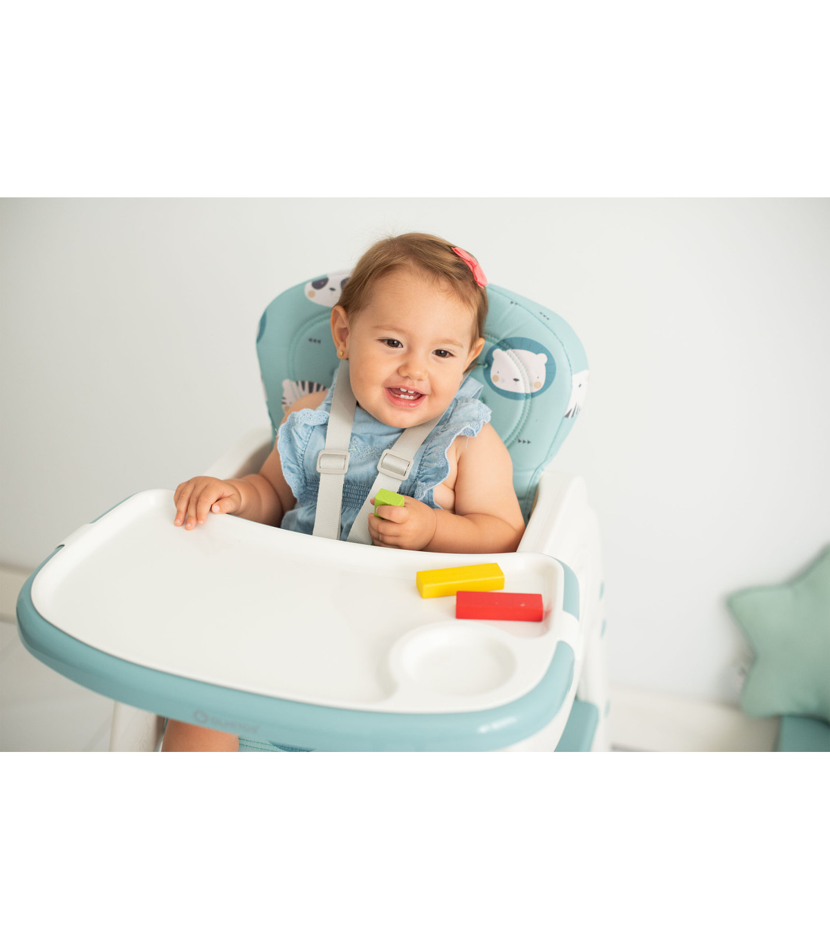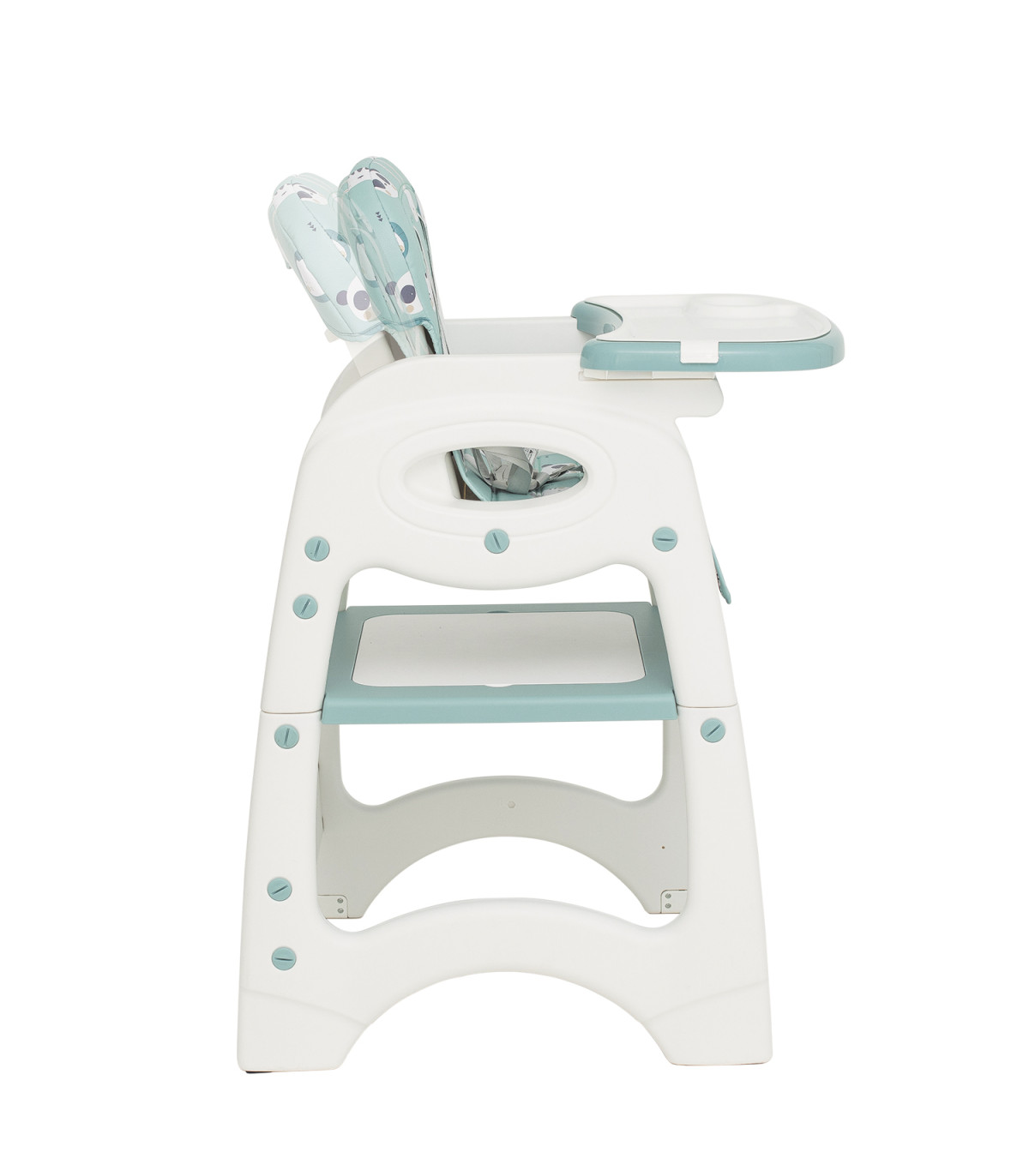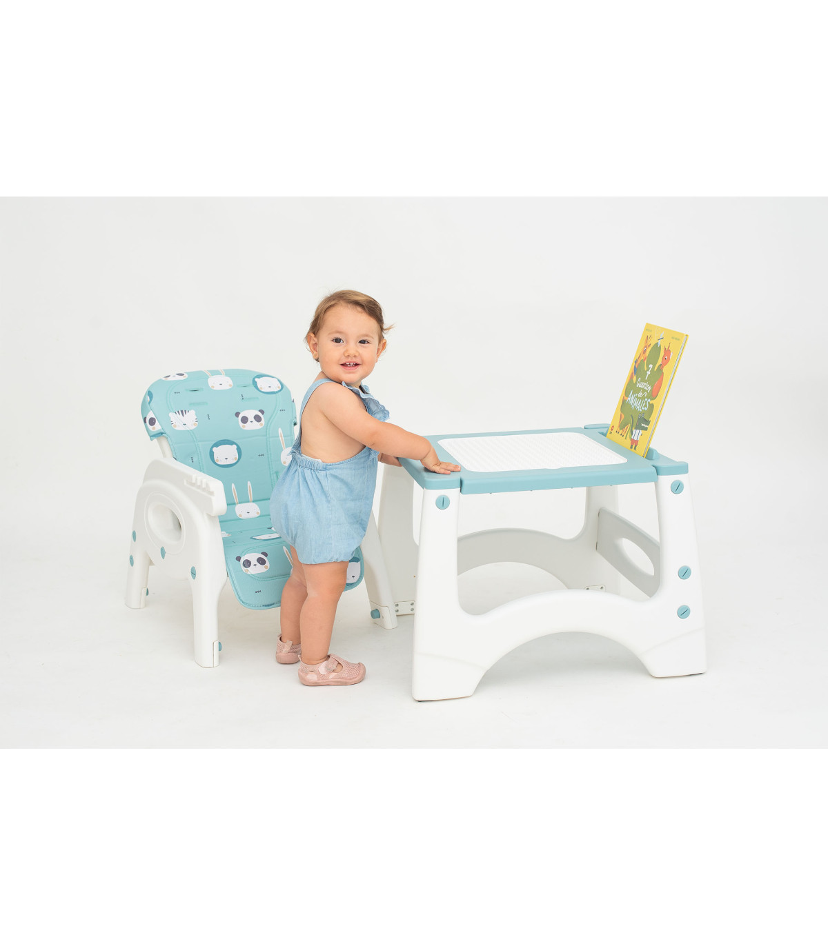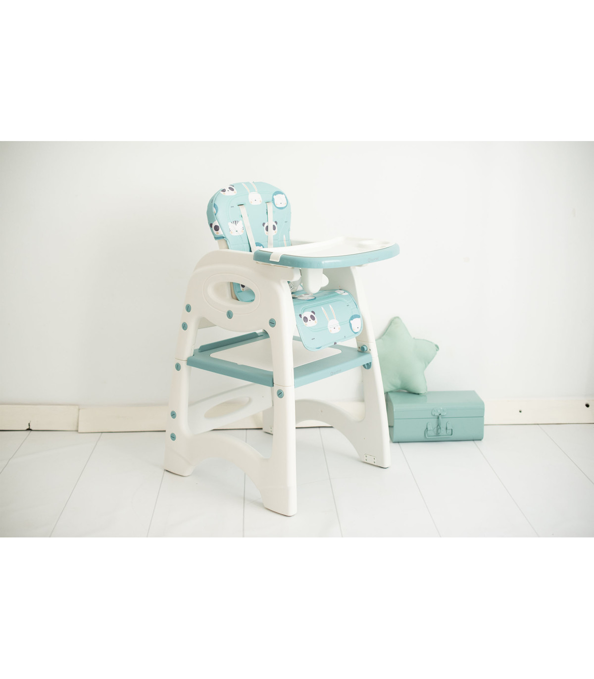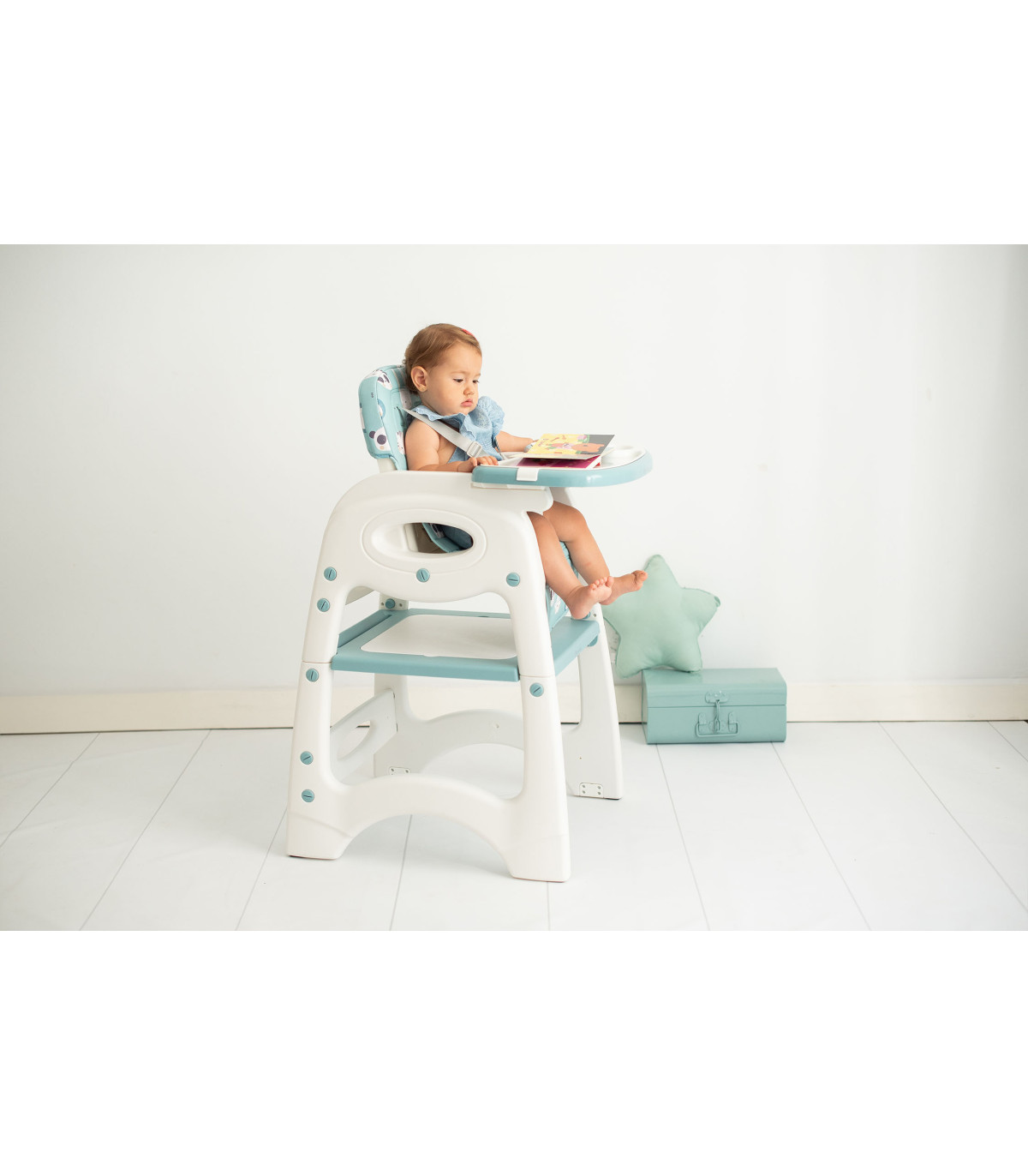 A cadeira alta conversível com 5 funções em 1 é uma solução prática e versátil para a alimentação das crianças dos 6 meses aos 6 anos. Primeiro como cadeira alta até aos 3 anos e depois como mesa e cadeira infantil não só para comer, mas também para brincar ou desenvolver sua arte.