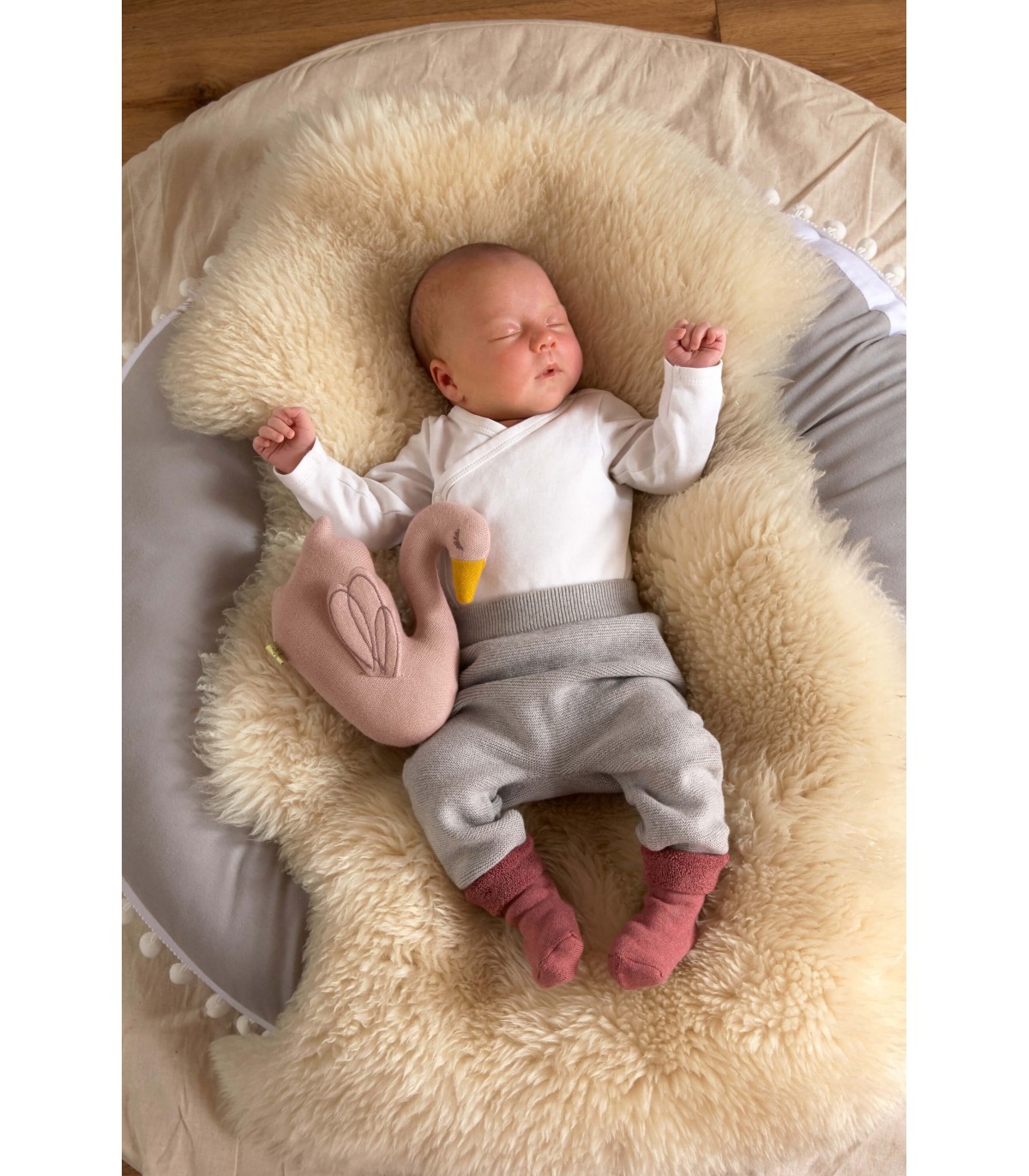 A mistura de fibras naturais de algodão orgânico (GOTS) e seda Eri, que não danifica a pele, é adequada para todas as estações. Suas propriedades de regulação de temperatura garantem uma temperatura ideal para o conforto tanto no verão quanto no inverno. O material é particularmente macio e delicado, mantém sua forma e é suave como seda na pele do bebê. A seda Eri acabada difere de outros tipos de seda devido ao seu processo de fabricação amigo dos animais. O fio de seda não é desenrolado do casulo até que a borboleta tenha saído do casulo.