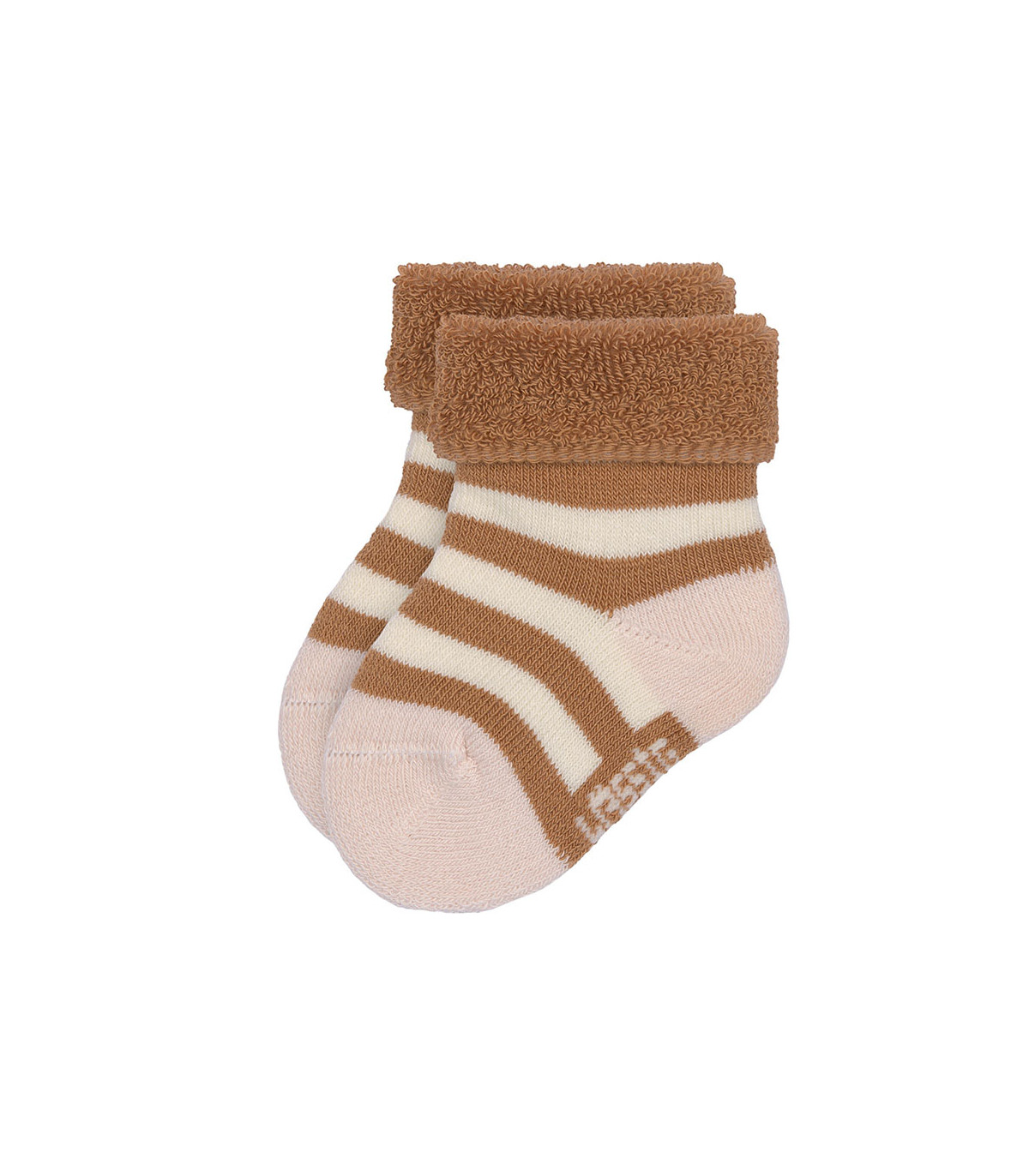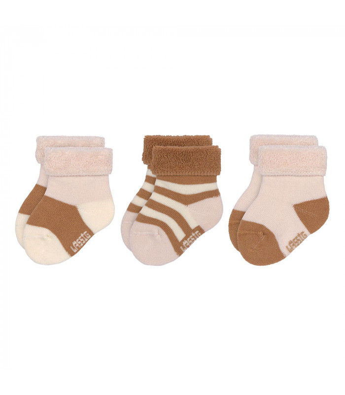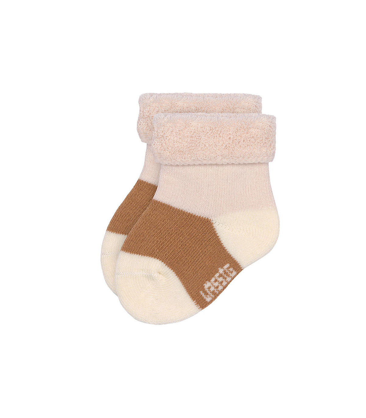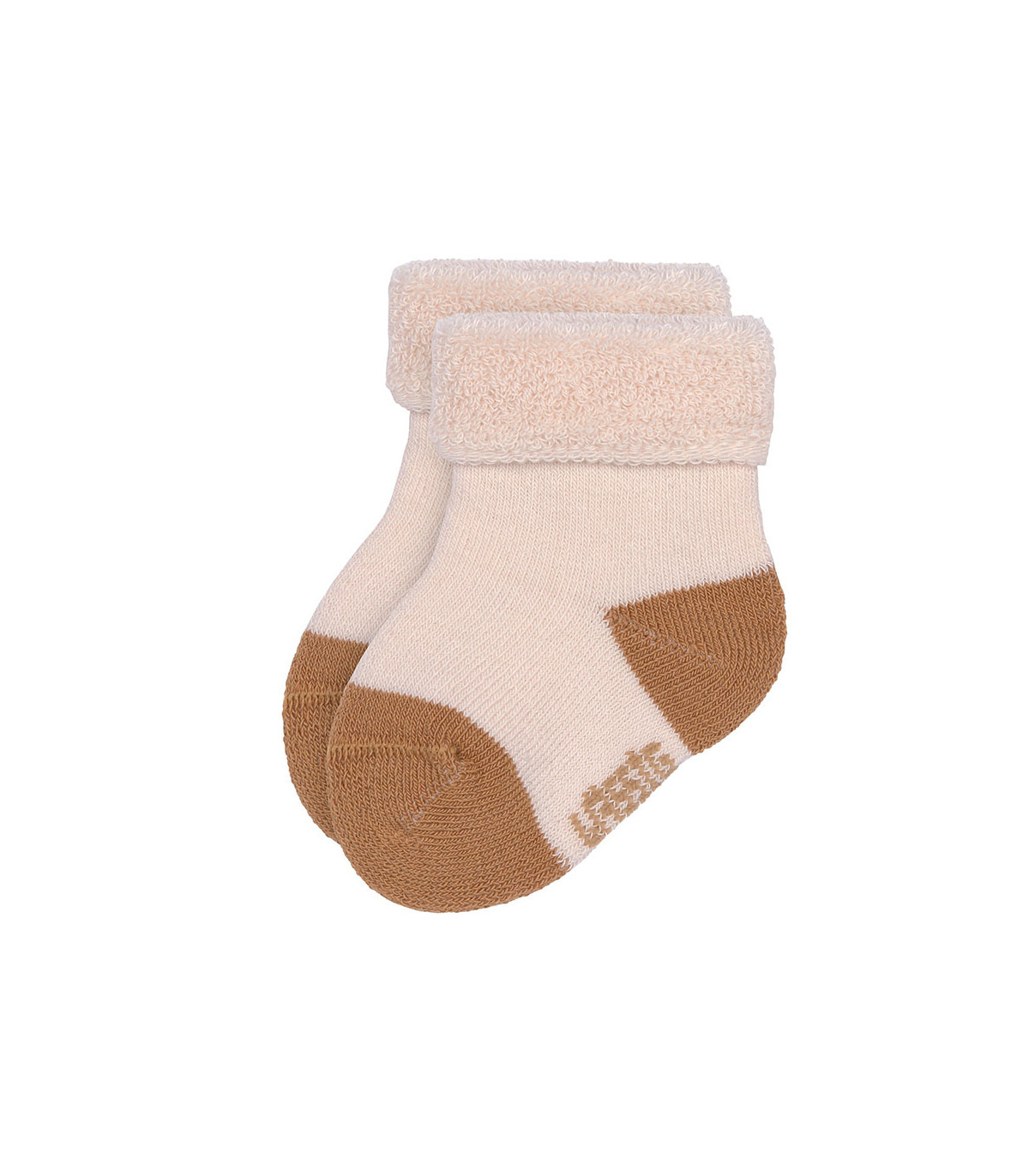 Meias de pelúcia suaves e quentes para recém-nascidos. A banda dupla na parte superior mantém os pés do bebé confortáveis e protegidos do frio. Feitas de algodão orgânico, são respiráveis e macias para a pele sensível do bebé.
