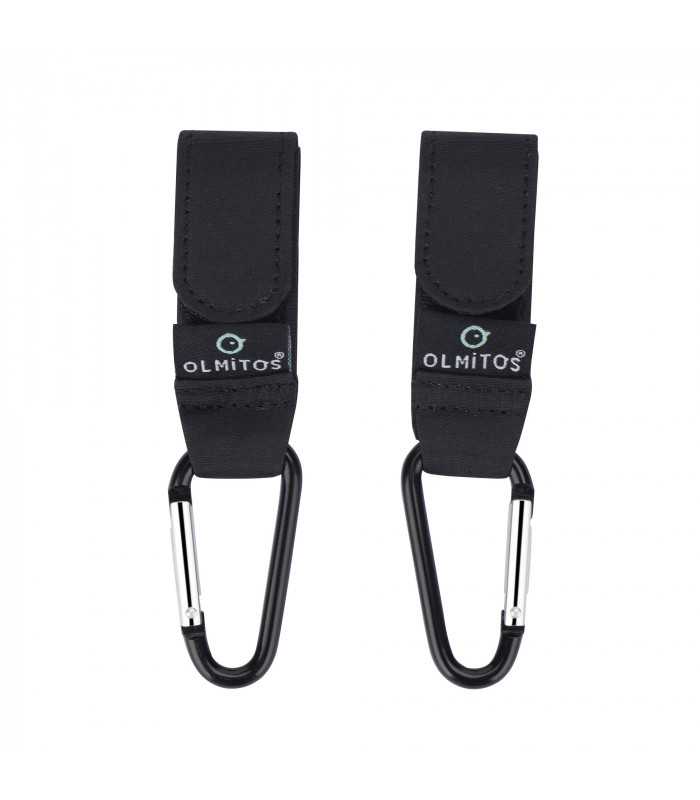 Ganchos adaptáveis ao carrinho, berço ou qualquer barra. São fáceis de colocar e tirar graças ao velcro e seguros por terem mosquetões.
