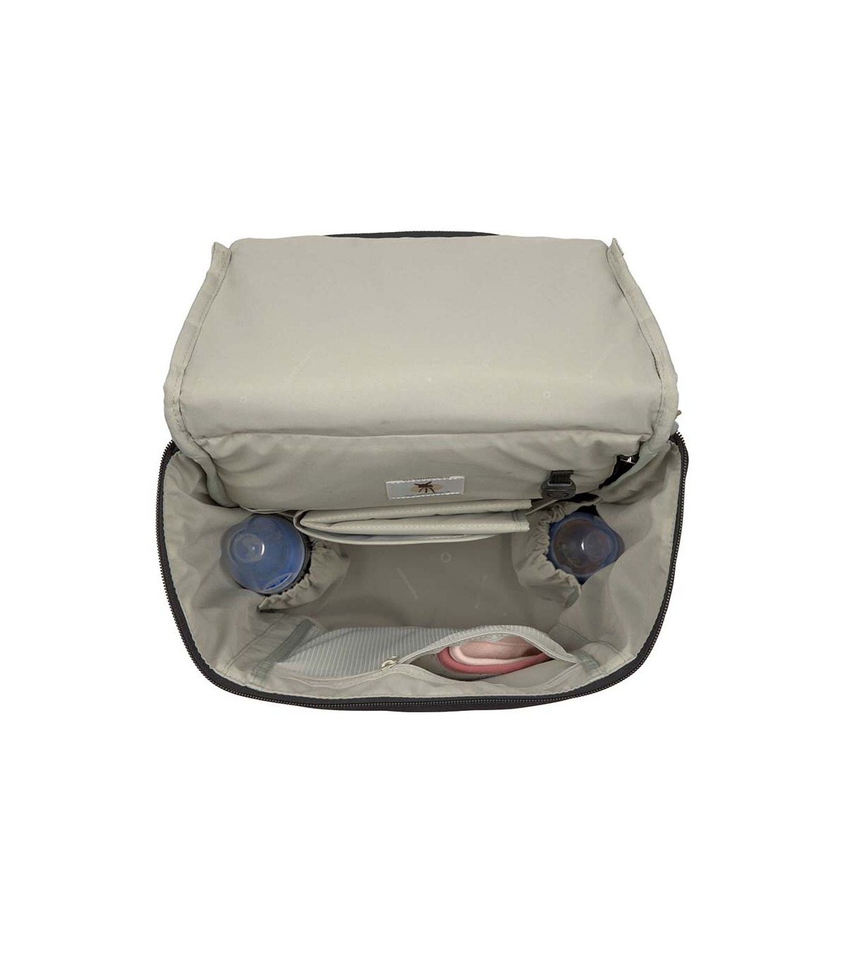 - Os ganchos incluídos permitem prender a mochila a um carrinho de bebé ou uma mala de viagem.