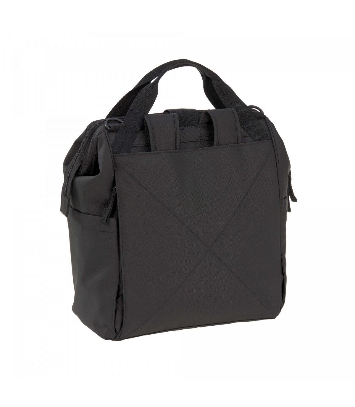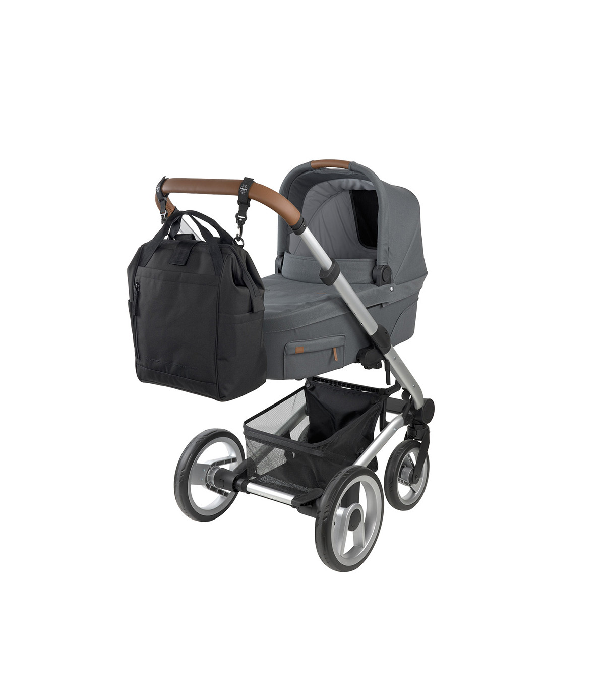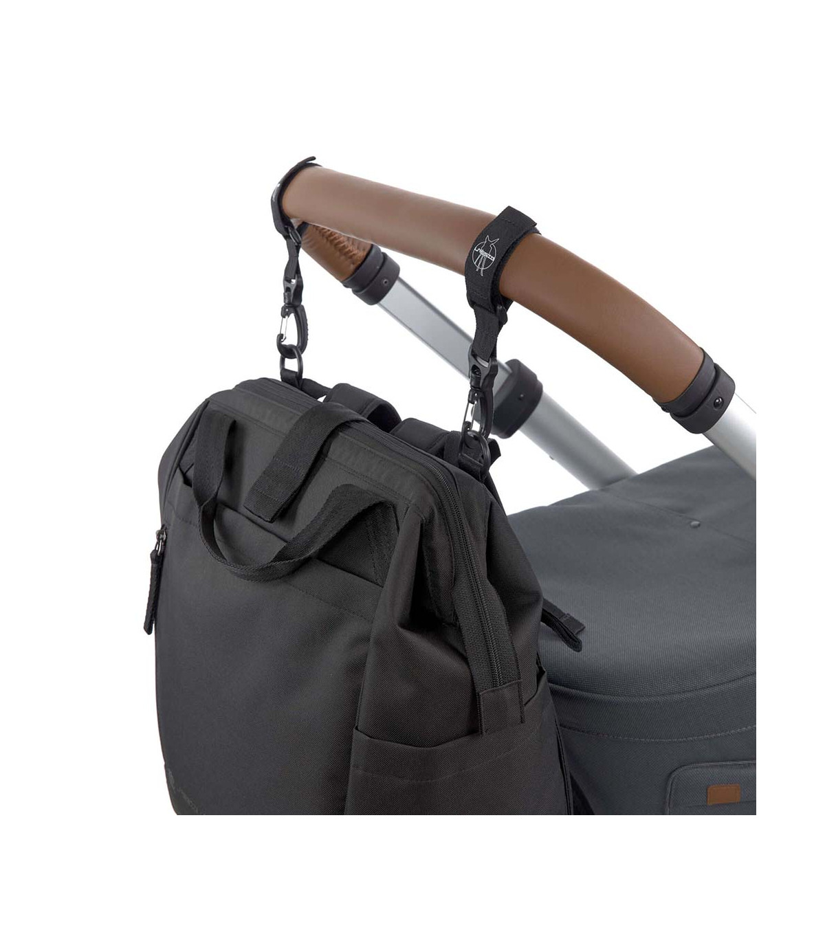 - As duas alças de ombro podem ser guardadas no compartimento traseiro da mochila, transformando-a em uma bolsa de transporte num piscar de olhos. Também pode ser usada como bolsa transversal e de ombro (uma alça de ombro separada é incluída) ou acoplada ao carrinho de bebê com os ganchos incluídos.