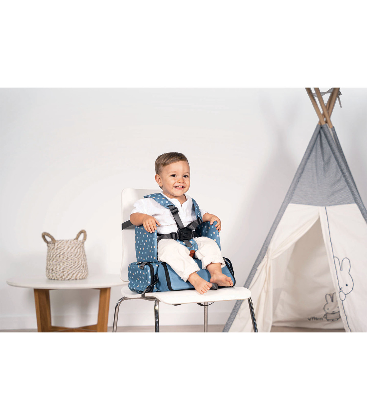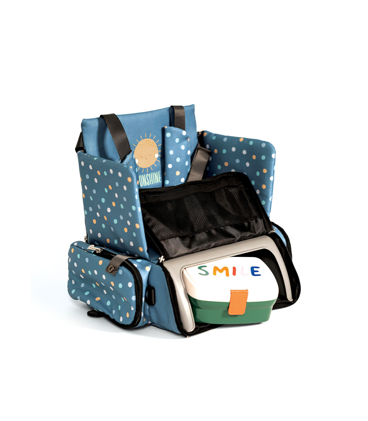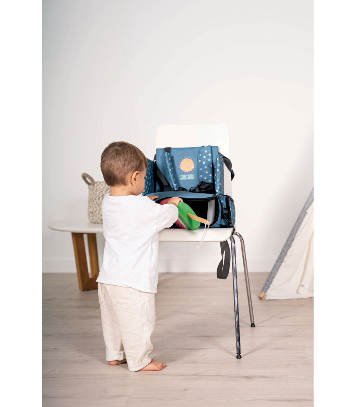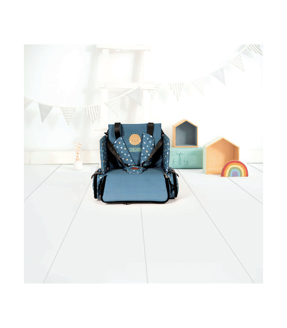 O assento elevatório dobrável é leve e fácil de transportar graças à sua alça ajustável. Com um arnês de segurança de 5 pontos e correias ajustáveis, ele garante a segurança da criança firmemente em qualquer cadeira. Possui bolsos práticos para babadores e brinquedos, e sua base rígida oferece um suporte confortável. Além disso, possui um compartimento interno para organizar os itens essenciais do bebê e pode ser facilmente removido para uma limpeza ideal. Ideal para famílias ativas, pode ser transportado como mochila ou bolsa a tiracolo.