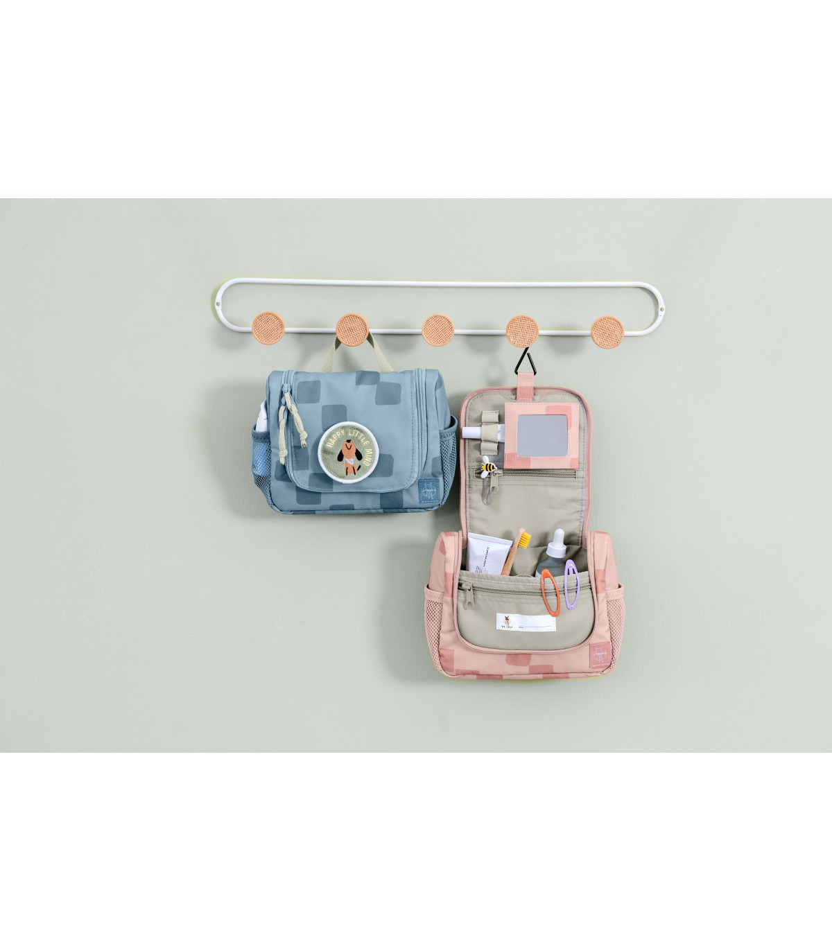 O Mini Washbag é perfeito para crianças, seja em eventos esportivos, de férias ou em casa. O sabonete, gel de banho, produtos para cuidados com a pele e uma escova de cabelo podem ser guardados no compartimento principal bem organizado. A escova de dentes, a pasta de dentes e acessórios, como grampos de cabelo, podem ser colocados em dois bolsos internos de malha e no bolso com zíper separado.
